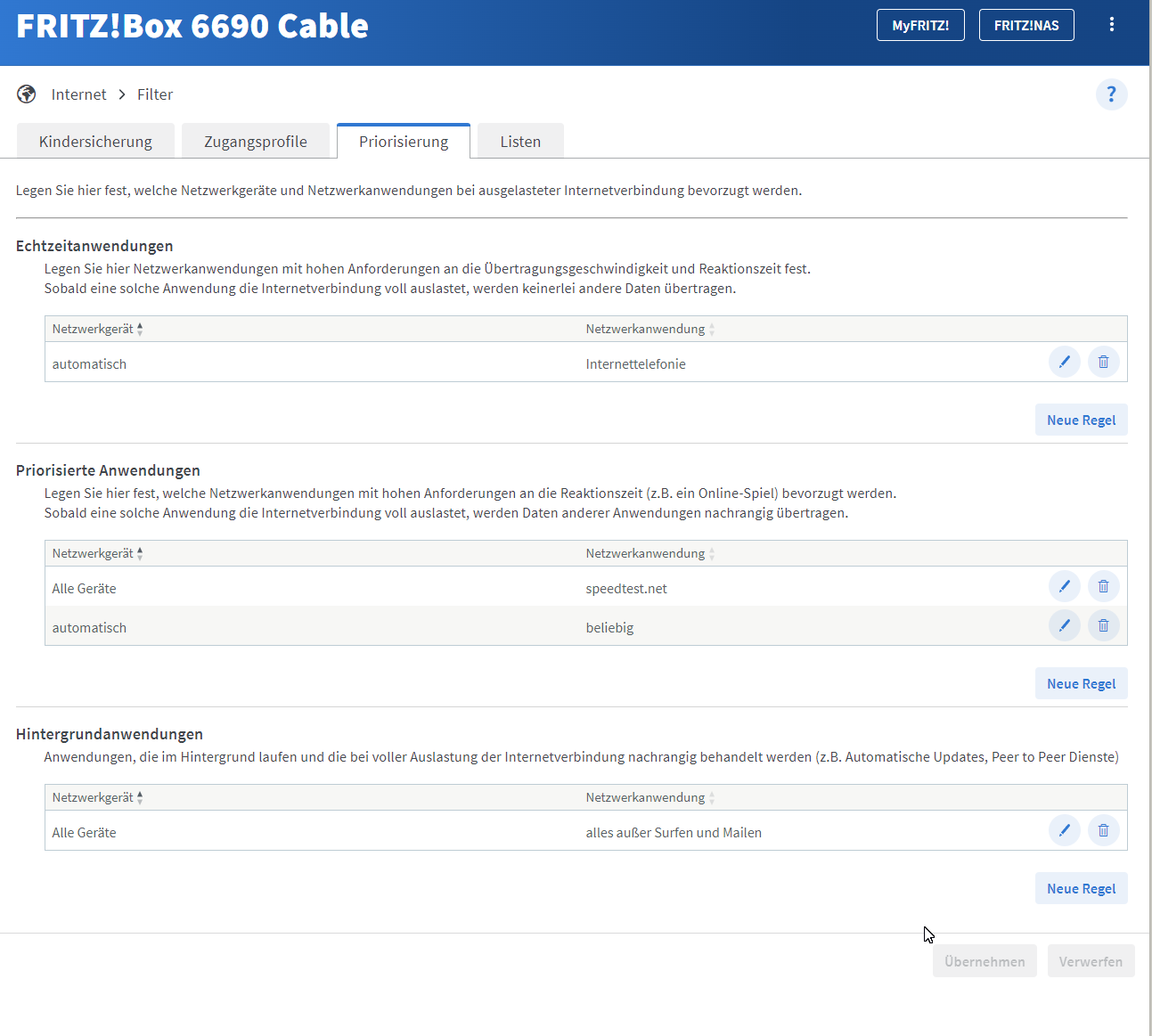 Unter Priorisierung habe ich nichts Besonderes eingestellt und bis auf die Telefone habe ich sogar alles testweise herausgelöscht.