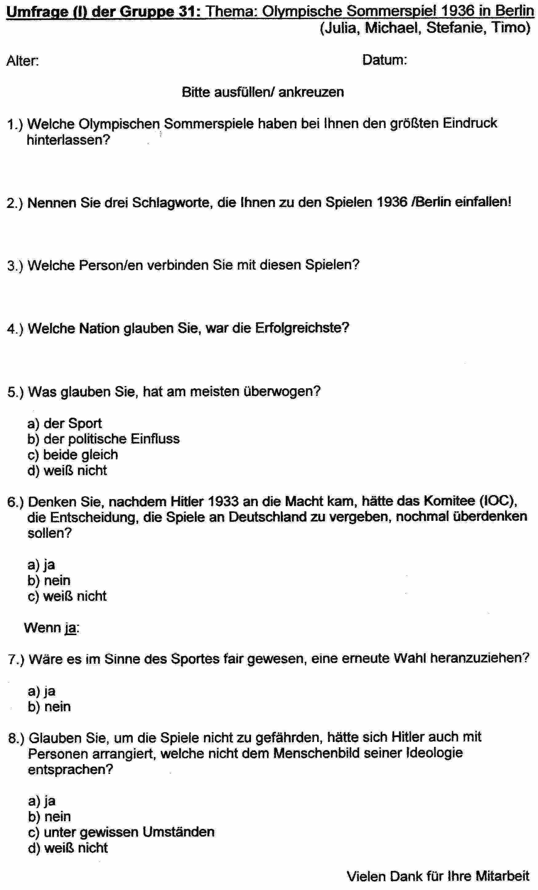 Ich will im Rahmen meiner Seminarfacharbeit, zum Thema "Die Olympischen Spiele 1936 in Berlin", eine Umfrage machen.