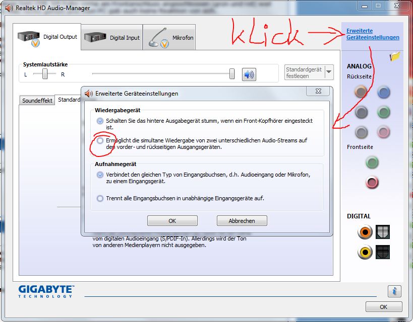 In den Win7 Soundeinstellungen, unter der Option ,,Wiedergabe'' steht Lautsprecher (Standardgerät) müsste ja eigentlich meine Boxen sein, ist aber auch gleichzeitig mein Headset?! Und darunter steht noch Realtek Digital Output. Mein USB Headset wure da extra noch angezeigt, deswegen konnte ich das auch so leicht einstellen aber mein Sennheiser headset steht da nicht drin. Und das ist das problem.