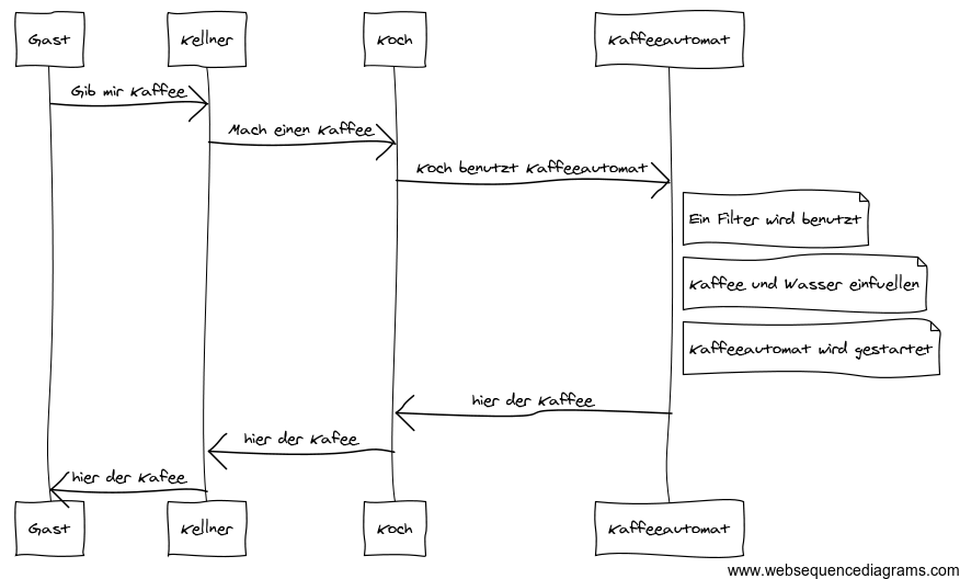 Ein Gast bittet den Kellner, ihm einen Kaffee zu bringen. Der Kellner ordert diesen beim Koch. Der Koch setzt nacheinander einen Filter ein, füllt Kaffee und Wasser ein und startet die Kaffeemaschine. Die Kaffeemaschine liefert den Kaffee an den Koch. Dieser gibt die Tasse an den Kellner weiter. Der Kellner stellt die Tasse auf den Tisch des Gastes.