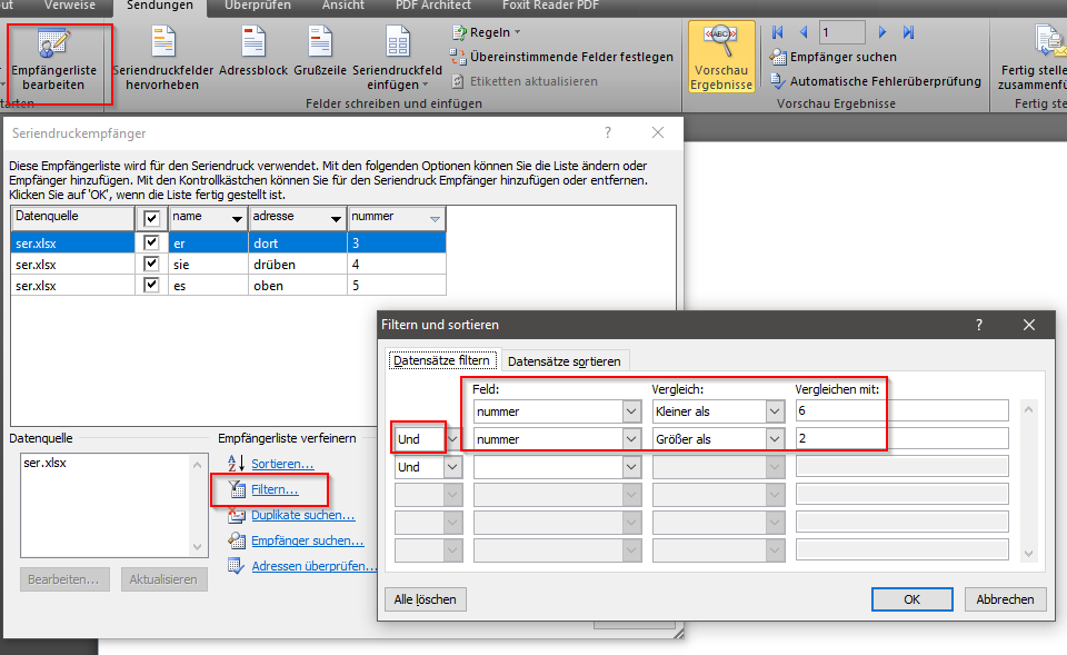 Ich habe gerade einen Serienbrief mit eine Exceltabelle (dient als Datenbank) erstellt. Nun wenn ich z.B. die ersten Datensätze in Word ausdrucke und am nächsten Tag weiter machen möchte oder diese ggf wegen Fehler in der Sortierung ändere, weiß ich nicht mehr wen habe ich angeschrieben also ausgedruckt und wen nicht.