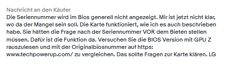 Der Käufer hat nach fast 1 Monat behauptet, dass die Karte überhaupt nicht geht. Er war sogar im PC laden. Sie haben die Karte getestet und sogar ein Prüfbericht ausgestellt.