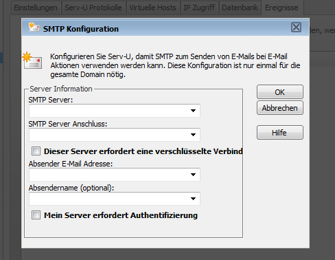 wie in einem anderen Fred bereits erwähnt, habe ich mir vor kurzem einen eigenen kleinen Home-server hingestellt. Dieser läuft auch ganz gut (nur ein RAM-Riegel hat wohl den Zusammenbau nicht überlebt, wodurch ich nur 1gb ram hab momentan :-/ ) aber ich will jetzt noch das ein oder andere Feature von Serv-U austesten. So ist es laut Hilfetext möglich , dass Serv-U mir bei bestimmten Events (Nutzer melden sich an/ab, laden dateien hoch/runter usw) Emails an eine von mir bestimmte Adresse schickt. Nur leider komme ich mit dem Konfigurationsmenu nicht ganz klar. Was muss ich bei Serv-U genau unter "SMTP-Konfigurieren" einstellen, damit mir mein Server solche Emails schickt?