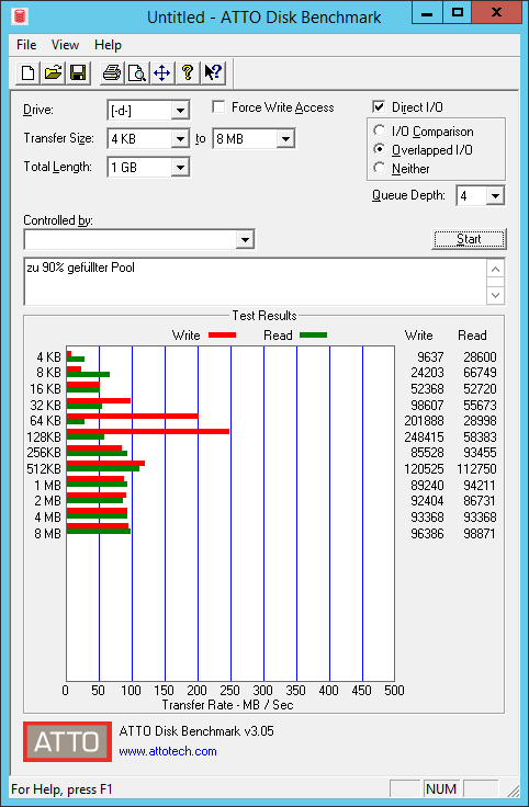 Als das Pool leer war habe ich folgende Werte erhalten: (habe mich in den ATTO-Settings an Krautmasters Storage Tiering Thread gehalten, falls den wer gelesen hat)