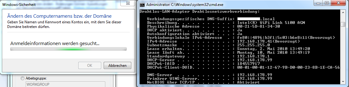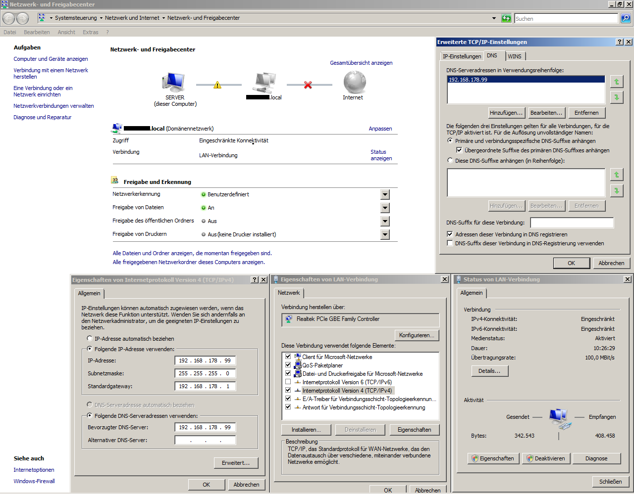 Wenn ich mich nun am Client (Windows 7) anmelden möchte, dann kommt das Dialogfenster "Anmeldeinformationen werden gesucht..." - drückt man nach (längerem) warten auf abbrechen, dann stürzt die Anwendung ab. Egal ob Domänenbeitritt, Remotedesktop (ist auf dem Server aktiviert) oder Zugriff via Explorer (\\Server).