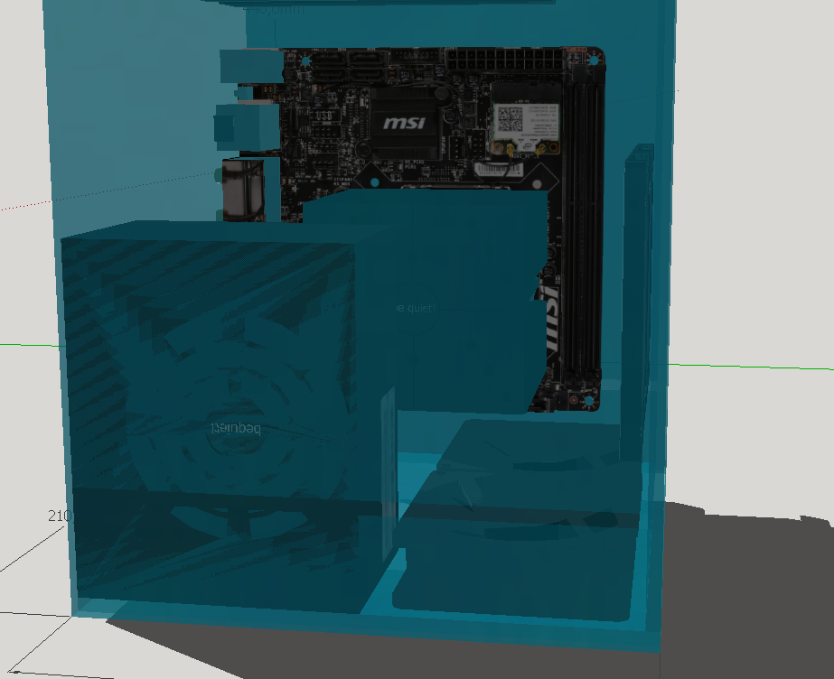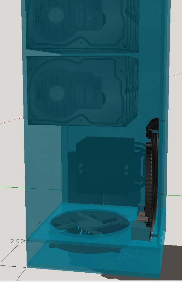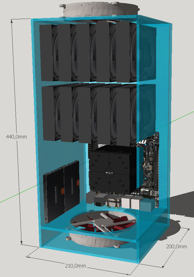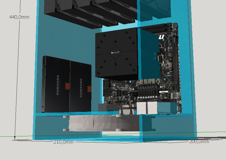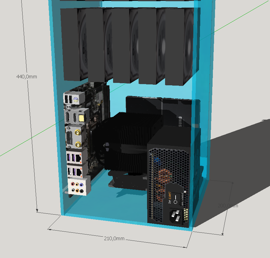 Ich habe noch weitere, allerdings reichen die schon, dass man kein fertiges Gehäuse mehr findet. Daher habe ich mich mal an eine Zeichnung für die Raumaufteilung gemacht. Vielleicht könnten die erfahrenen Modder dieses Forums mal schreiben, ob ein sollches Case eine Chance auf Realisierung hat.