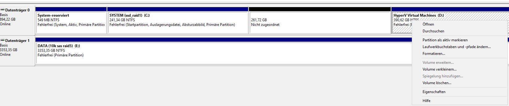 Jetzt wollte ich die HyperV Partition vergrößern, ist jedoch ausgegraut - nehme an da nach zusammenhängend d.h. links davon angezeigt, siehe Anhang.