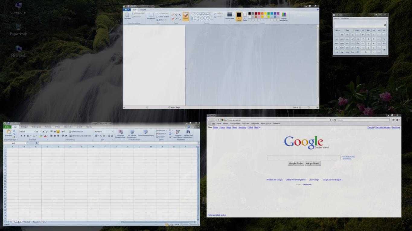 Jo das is die klassiche Ansicht von Windows 7. aber durch Setpoint wird eine andere Ansicht erzeugt. Dabei werden die Programme nicht hintereinander "gestapelt" sondern nebeneinander. Finde das viel übersichtlicher. Aber wills halt nicht immer mit der Maus starten, weil ich bei meinem Notebook nicht immer ne externe Maus benutze =)
