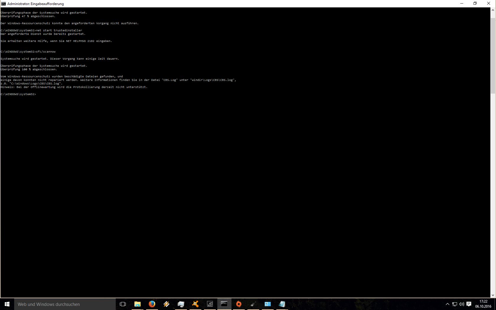 Nun habe ich heute mal "sfc/scannow" durchgeführt (Als Admin die Eingabeaufforderung gestartet). Beim ersten mal ist er bei 47% abgebrochen "Der Ressourcenschutz konnte den angeforderten Vorgang nicht ausführen"... Habe dann "net start trustedinstaller" eingegeben, wo dann gesagt wurde "Dienst schon gestartet" und danach nochmal "sfc/scannow" ausgeführt, der diesmal durchging, und beschädigte Dateien gefunden hat, diese aber wohl nicht reparieren kann.
