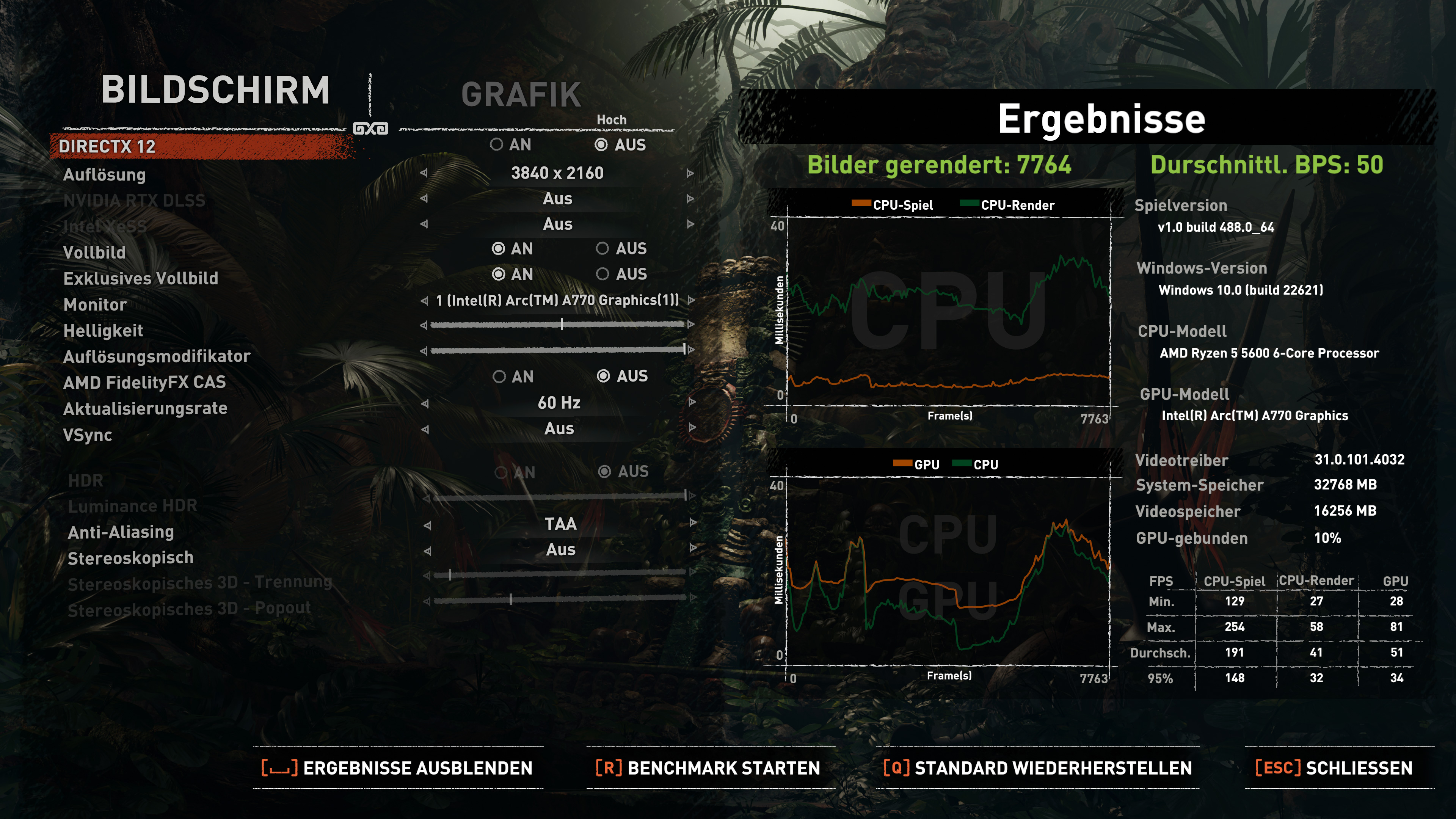 Damit es der kleinen Arc A770 nicht langweilig wird... 😉. In 1080p, 1440p und 2160p mit DX11, DX12 und DX12 XeSS (Qualität), alles auf Preset Hoch.