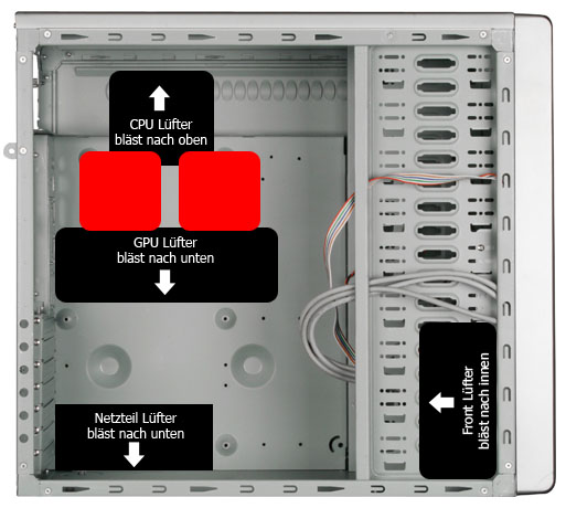 Hab jetzt das Sharkoon R9 Alu, und wollte im Seitenfenster jetzt mal 2 Kühler anbringen (die Roten Kästchen in der Skizze), nur stellt sich bei mir die Frage, sollen die Kühler die Luft rein oder Rausblasen?