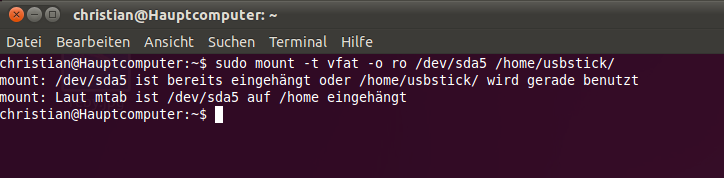 ich habe ein Problem mit dem Shell-Befehl mount. Und zwar wenn ich einen USB-Stick per Hand einbinden möchte, kommen bei mir immer irgendwelche (Fehler-)Meldungen auf der Konsole.