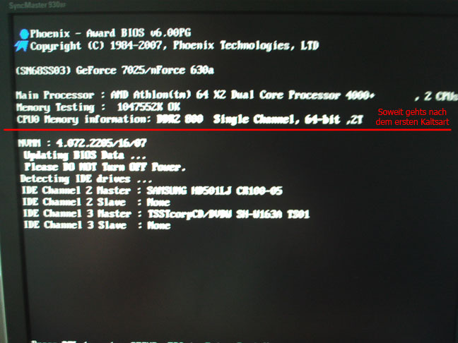 - Am Morgen wieder starten -> BIOS bleibt kurz vor Erkennung der Laufwerke stehn, es tut sich nichts mehr.