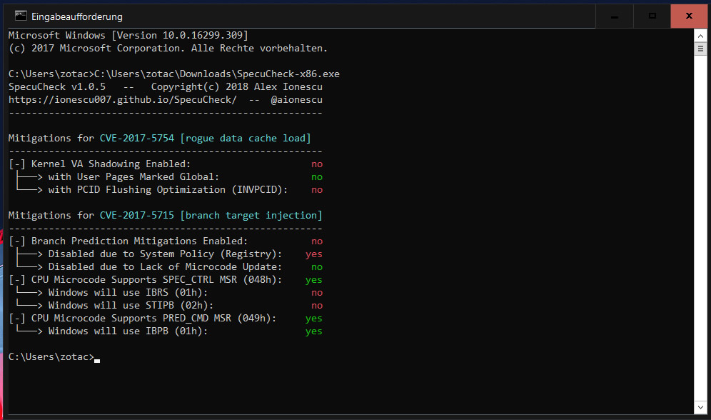 sieht aber irgendwie auch nicht besser aus! Das Witzige ist ja, das ich beim ersten Update des Microcodes im Januar alles auf Sicher hatte, dann wurde das Microcode ja zurückgezogen und der Schutz natürlich weg. Ich frage mich nur, was es dann mit dem Bios vom 11.03.2018 auf sich hat von Gigabyte, im welchen ja auch wieder ein Microcode Update genannt wird? Ich habe auch nochmals Windows Update durchgeführt, bevor ich das SpecuCheck 1.0.5 durchlaufen lassen habe, Windows 10_Pro-64Bit Build 16299.309 wird auch angezeigt.