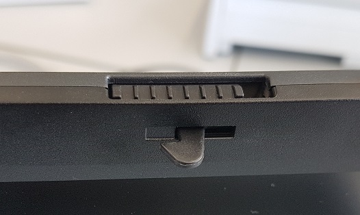 Das Scharnier hält das Display gut fest, schwingt bei Bewegung allerdings sehr stark nach. Es ist um fast 180° umlegbar. Der billig wirkende nur mittige Kunststoffriegel könnte jedoch auf Dauer ein Schwachpunkt sein.