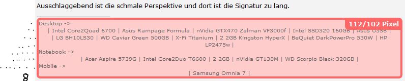 Laut Forenregeln ist es zwar erlaubt, 7 Zeilen bei Schriftgröße 1 zu haben, aber dennoch bin ich mit so einer Mega Signatur nicht glücklich.