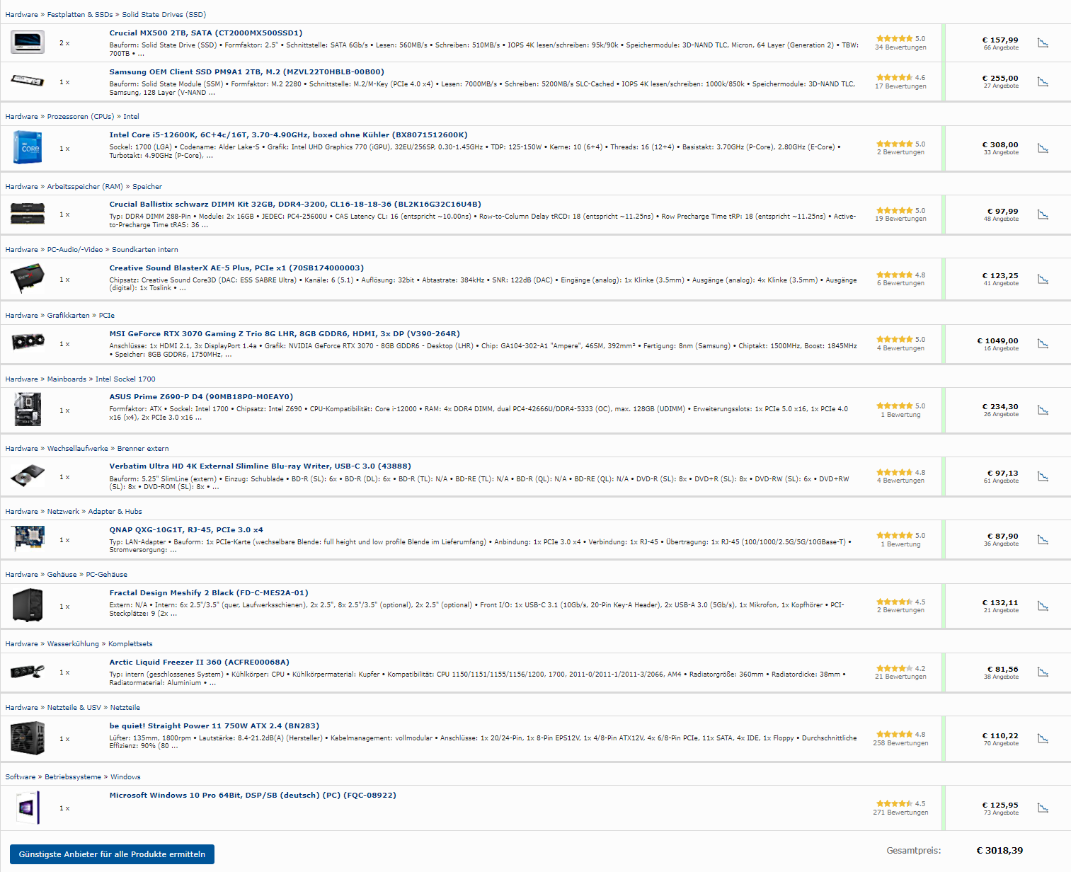 Ja, keine relevante Nutzung außer Office geplant. Intel aus eigenem Interesse. 10TB Speicher, siehe oben. Benötigt werden 2 Lan-Anschlüsse, siehe oben. BD-Brenner da einziges Laufwerk, werde aber überlegen, ob extern da nicht wirklich besser ist. Win 11 Pro aufgrund einiger Features, will direkt darauf umsteigen.wrglsgrft schrieb:Sicher, dass das so ist? Auch sonst keine spezielle relevante Nutzung geplant?