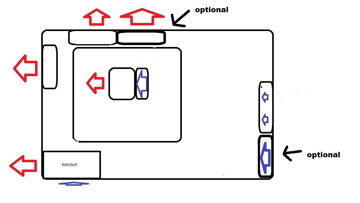 Ich werde den CPU lüfter dann demnächst auf die andere Seite bringen und an der stelle den unteren Gehäuselüfter anbringen. Nach oben möchte ich nichts pusten lassen, da das die Lautstärke relativ stark erhöhen würde.