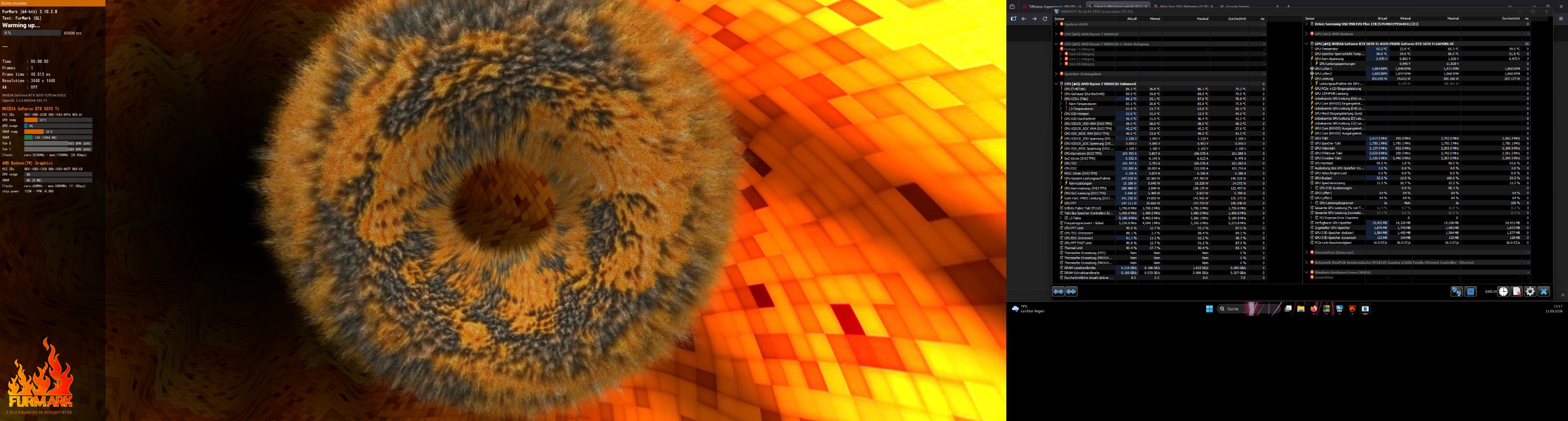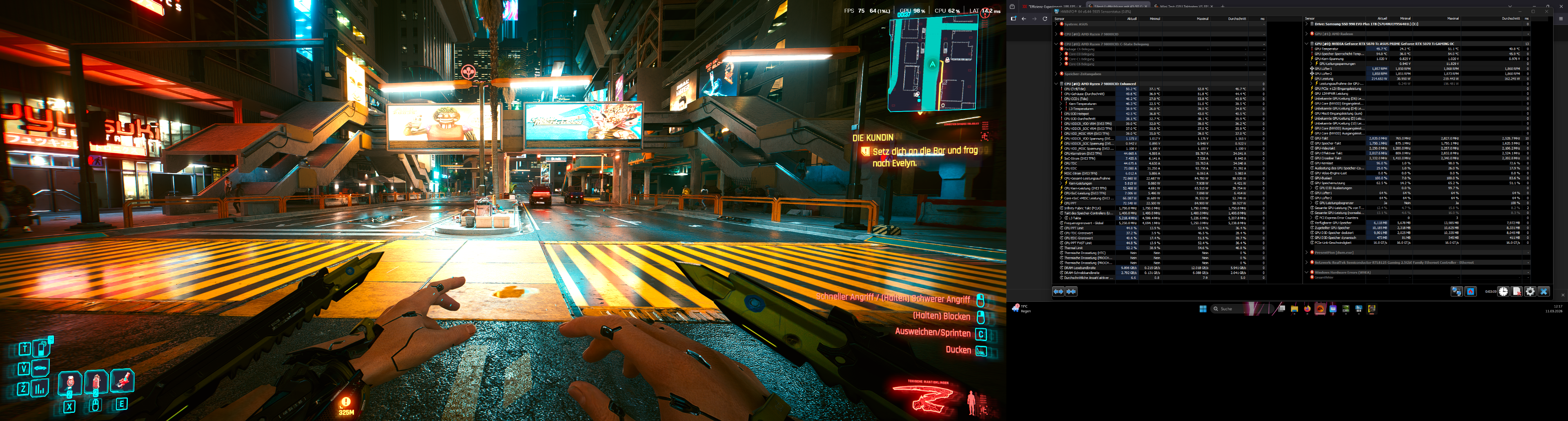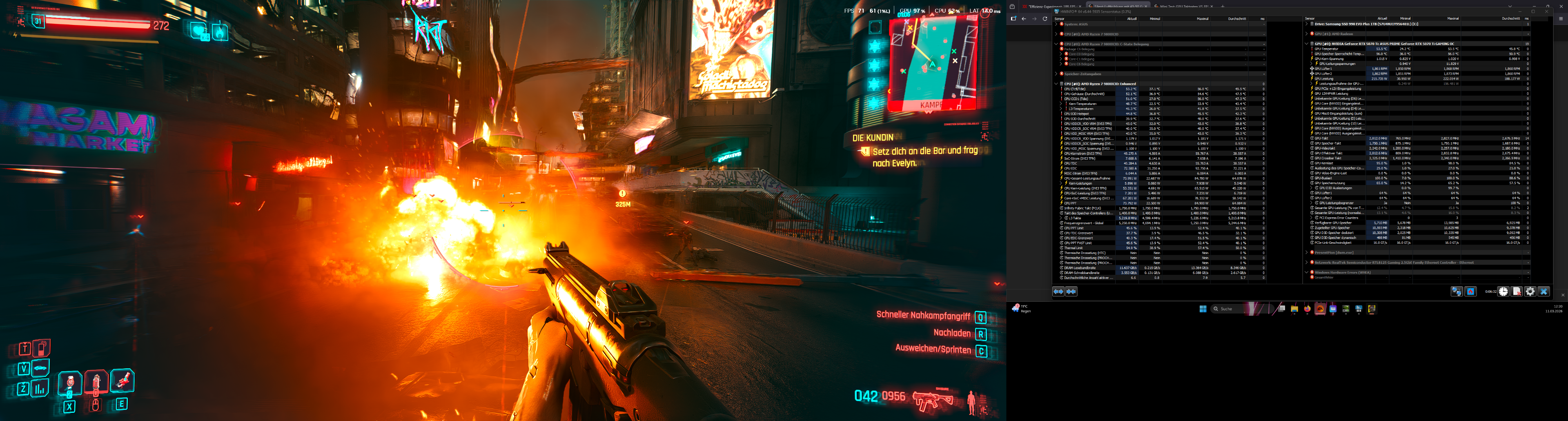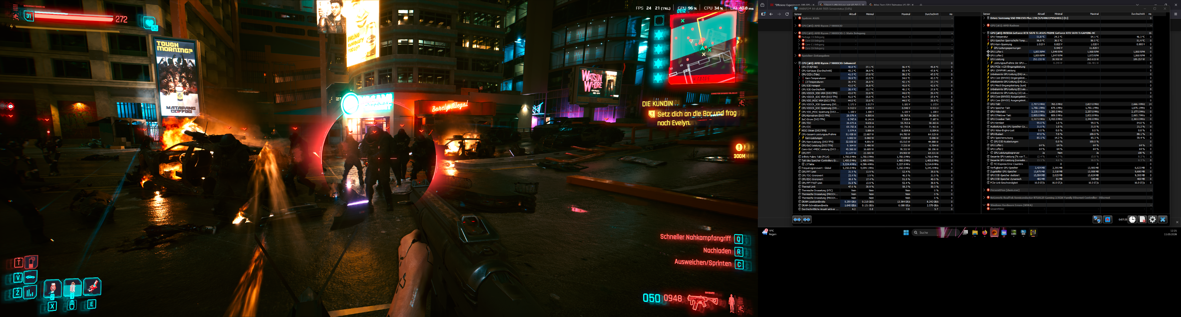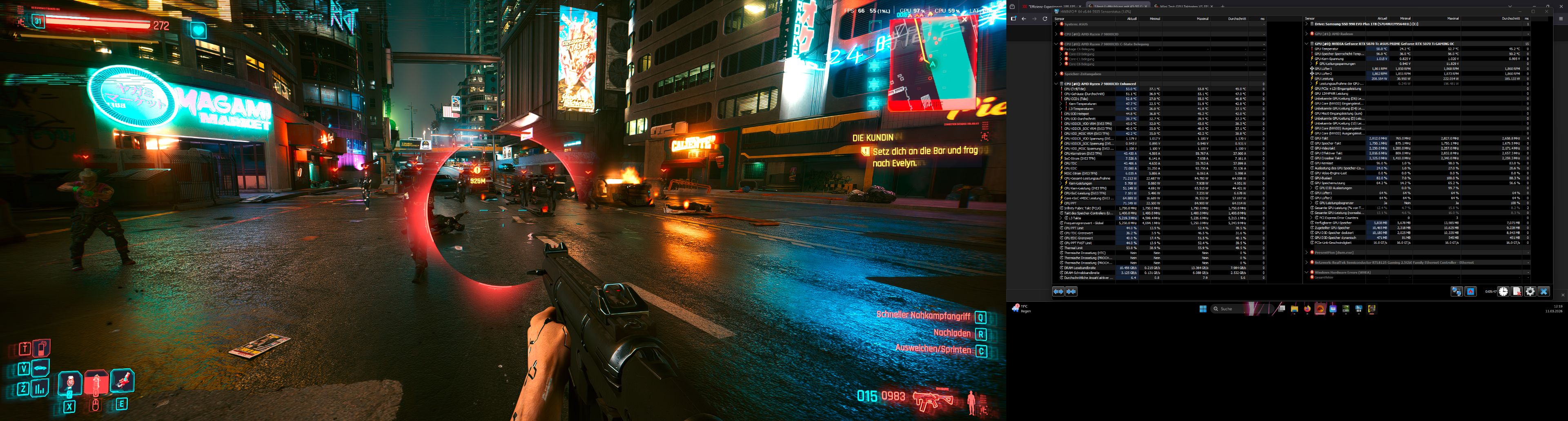 Die aufnahmen die du dort siehst sind mit meinen Handy gemacht worden während Cyberpunk am laufen war. Kein Alt+Tab Screenshot. Video dazu habe ich auch+ Temperatur im Raum.Kasjo schrieb:Also ich gehe ja stark davon aus das die Maximalen Werte, also 300 Watt GPU und 95watt CPU beim zocken anliegen. Sobald natürlich per Alt+Tab ausm game gegangen wird um die screenshots zu machen liegen andere werte an. Oder gibt deine GPU aufm desktop auch vollgas wenn das game minimiert is.