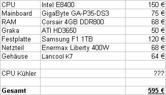 Als CPU tendiere ich zur E8400 da ich vorallem auch an der Interpolation von PAL TV/DVD's mit ffdshow interessiert bin, was ein Haufen Leistung brauch. P/L scheint bei 150€ doch besser als bei der alten E6xxx-Reihe und moderner ist sie auch.