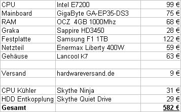 ich plane gerade einen neuen Rechner der hauptsächlich zum Arbeiten und zum TV/Filme (auch HD) schauen benutzt wird. Auch Bildbearbeitung gehört zu den Aufgabenbereichen des PC's, wesswegen ich 4GB Ram anpeile. Der PC soll also leistungsstark sein, gleichzeitig möchte ich aber diesmal einen wirklich leisen PC haben. Bisher hatte ich immer typische GamerPC's. (hauptsache schnell, Lautstärke war egal, hab ja eh ne 5.1 Anlage die das übertönt
