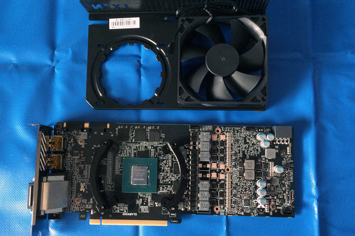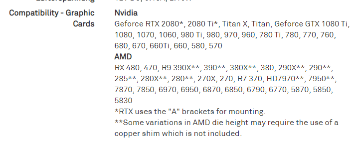 Das ganze sieht so aus. Der Lochabstand auf den GPUs ist so ziemlich immer der gleiche. Solange das Bracket was ans PCB kommt nicht mit irgendwelchen Komponenten kollidiert passt da die AiO drauf.