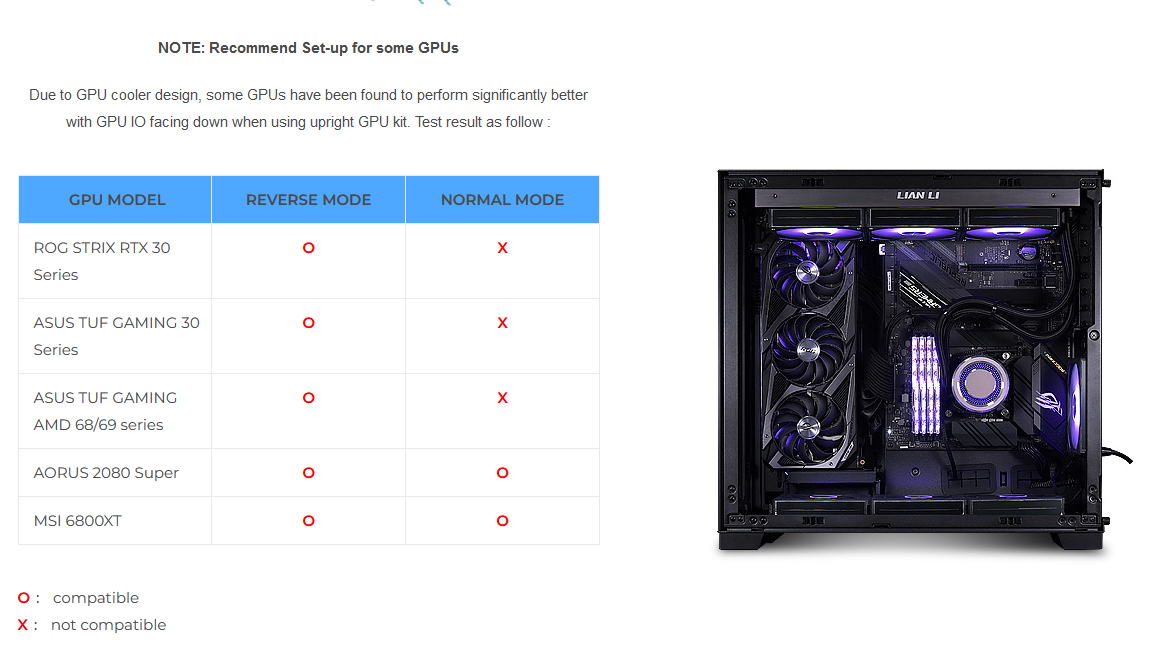bei vertikalem Einbau nicht aber wenn man die Karte "hängend" oder "stehend betreiben möchte, gibts Unterschiede aufgrund des Kühldesigns. Vielleicht schwebt dies einigen im Kopf herum. Gibt Gehäusehersteller, die darauf hinweisen. Z.B. Lian Li:Infi88 schrieb:Gab nie thermische Probleme bei vertikaler Installationen, es sind Hirngespinnste der Leute.