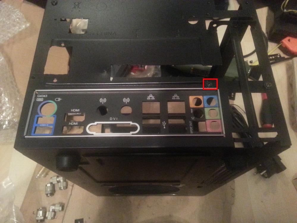 Angefangen bei der I/O-Blende. Eine Schraube für die Grafikkartenhalterung war im Weg. Also kurzerhand die Feile nochmal ausgepackt und die Blende passend gemacht.