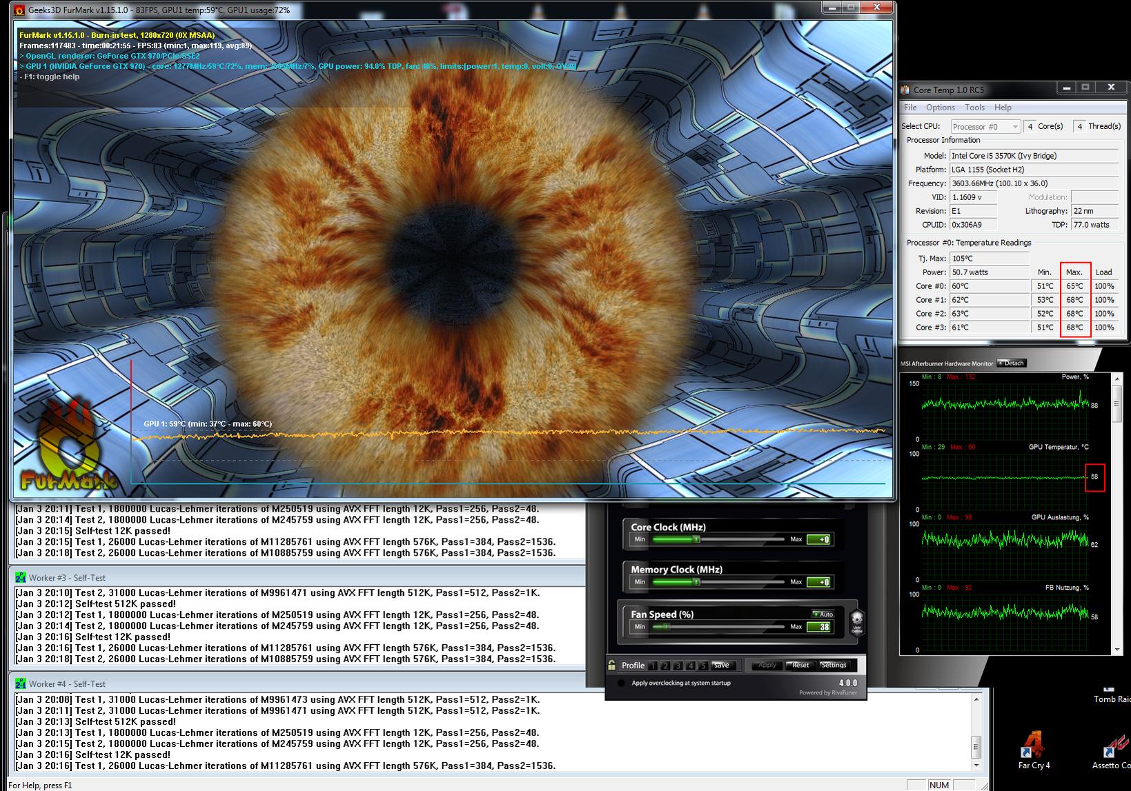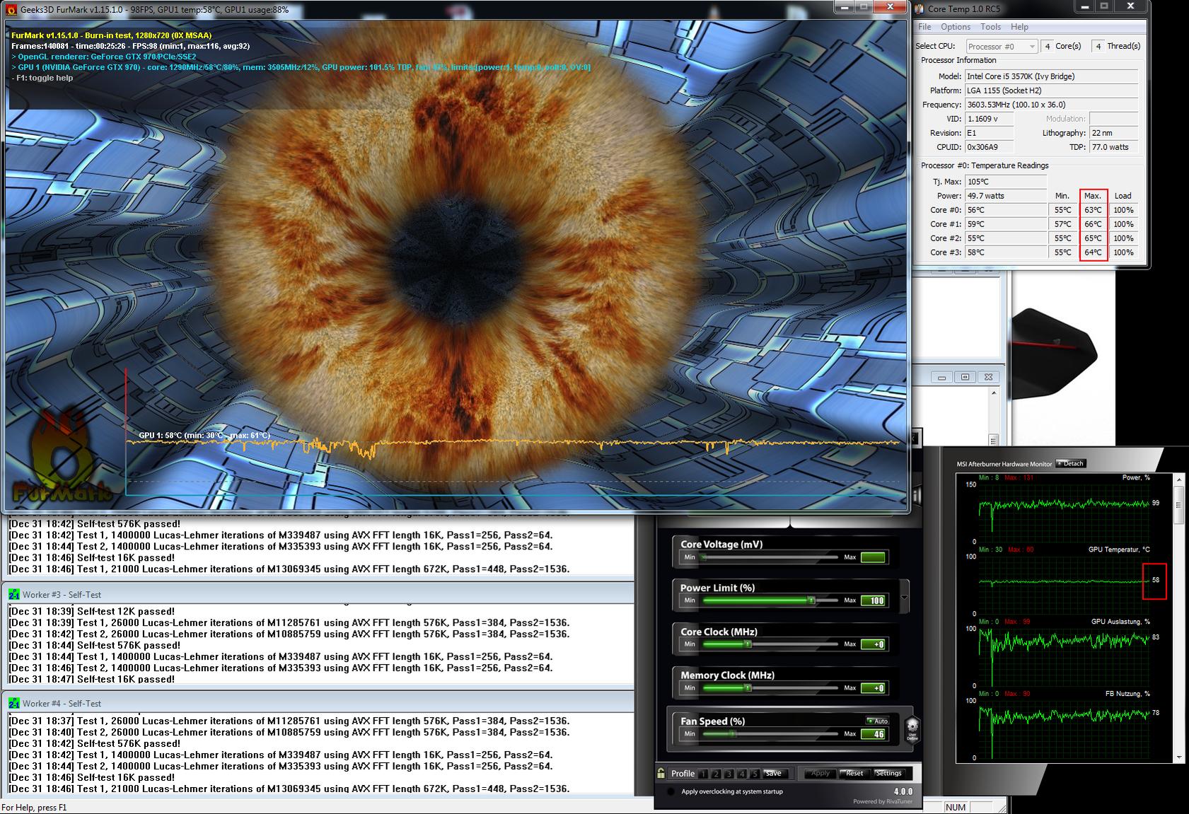 Ein Betrieb mit gedrosseltem Lüfter auf 7v war nicht drin. Da Prime und Furmark ein absolutes Extremszenario darstellen ist ein Betrieb über mehrere Stunden mit etwas reduzierter Lüfterdrehzahl sicherlich möglich.