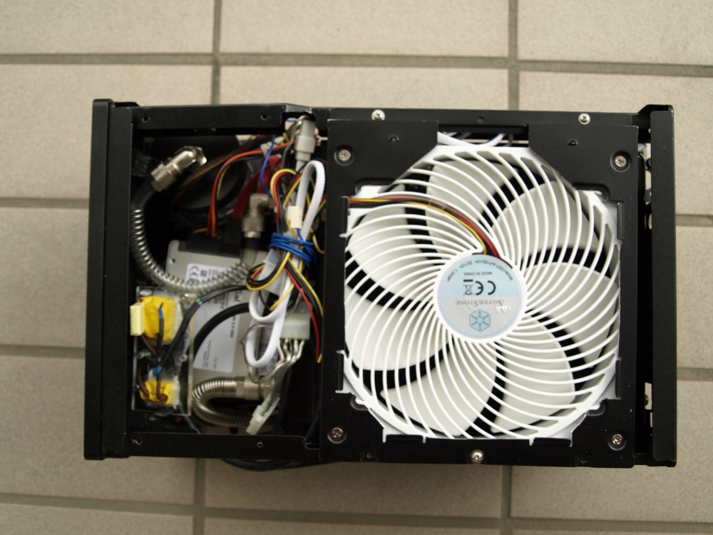 Zu meiner Überraschung waren die Temperaturen mit ausblasendem Lüfter selbst bei offenem Gehäuse besser. Meine Theorie zu den besseren Temperaturen ist, dass die Luft aufgrund des geringen Abstands zwischen Radiator und Grafikkarte (ca. 2cm) nicht schnell genug entweichen kann.