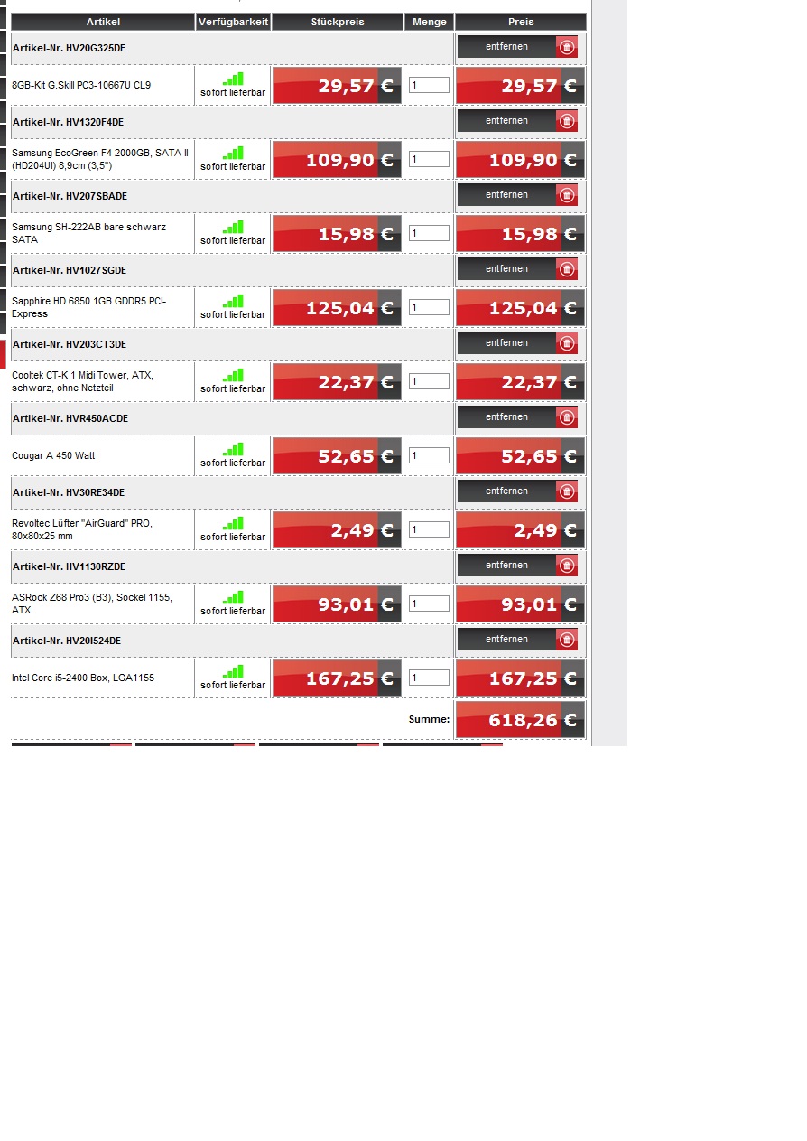 Würde auch folgendes raten: auf jeden Fall den i5 Prozzi. Würde auch ne 6870 gleich nehmen bei geringem Aufpreis. Kauf ne vernünftige Systemplatte, entweder ne kleine SSD oder z.B. ne Caviar Blue. Wenn die Preise für Festplatten wieder günstiger werden ne große für Daten dazu. Ansonsten reicht wie gesagt auch h67 board...bei ram reicht auch der 8gb teamgroup