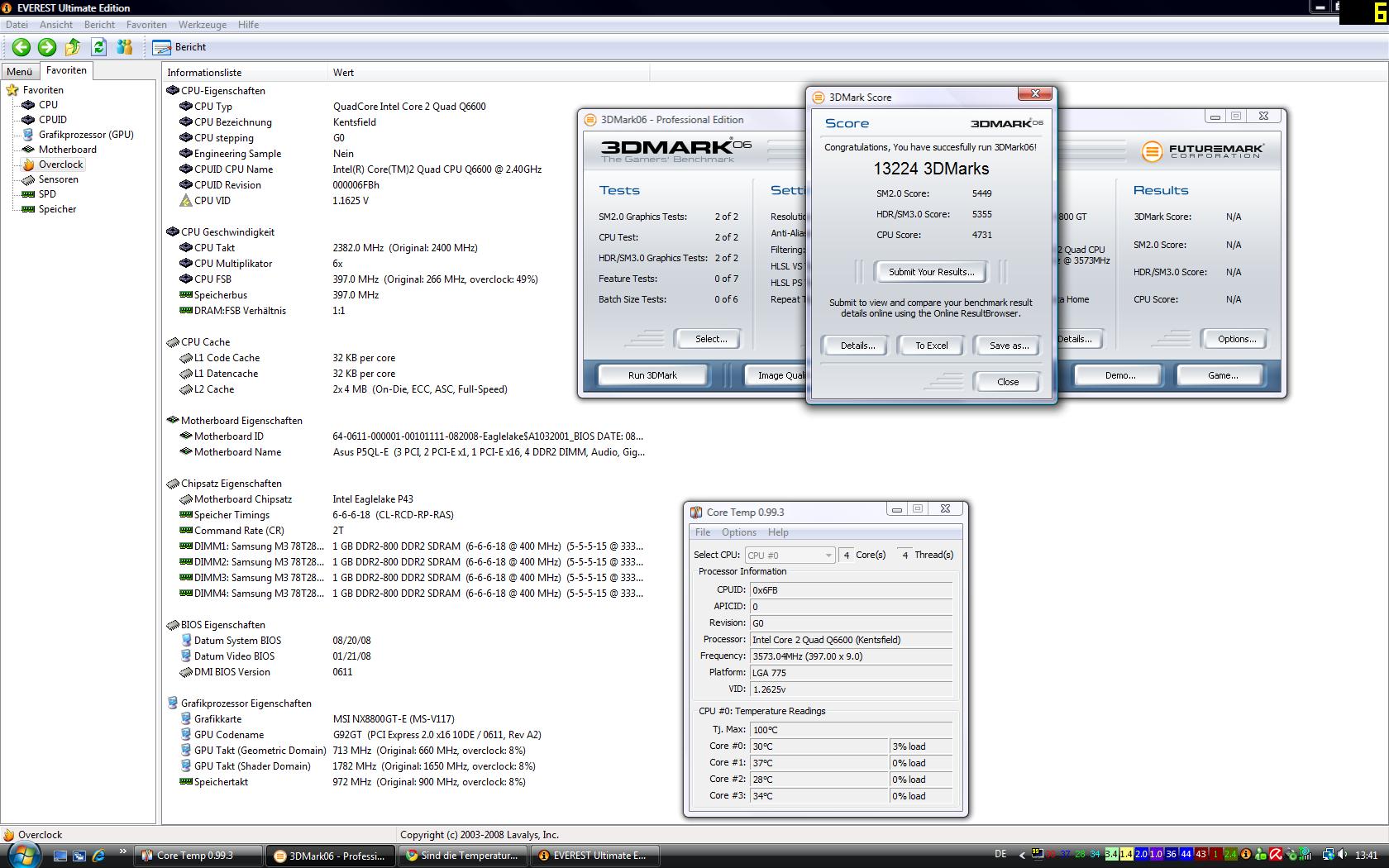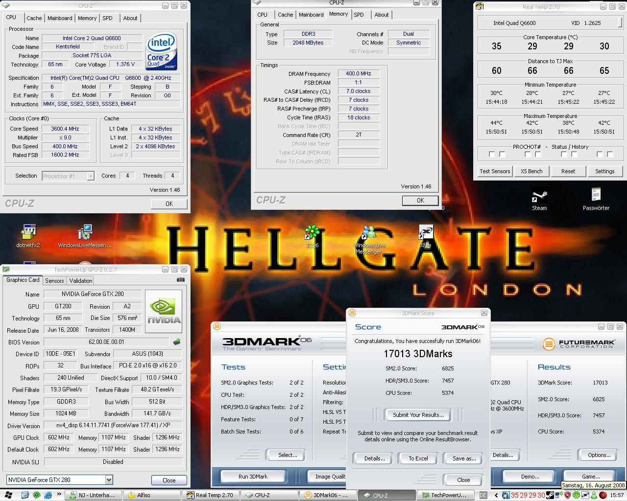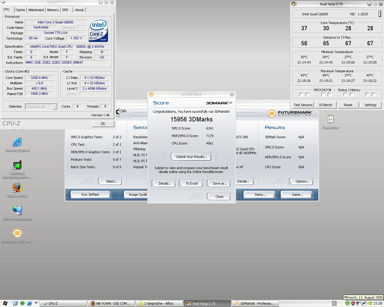 Ich hab aber ne leicht andere frage. Ich hab mein Q6600 auf 3,2 Ghz und 1,3V laufen. Wenn ich Intel Burn Test laufen lasse und mit Everest die Temps auslese ist CPU oft bei max. 64°C aber alle kerne laufen bei max.45°C. Ist das normal? Ohne belastung läuft er auf 44°C, core1 bei 16°C, core2 bei 22°C, Core3 bei 13°C und Core 4 bei 19°C. Hab ich was kaputt gemacht. Der höchste takt auf den ich gekommen bin war 3,6 Ghz bei 1,4V.