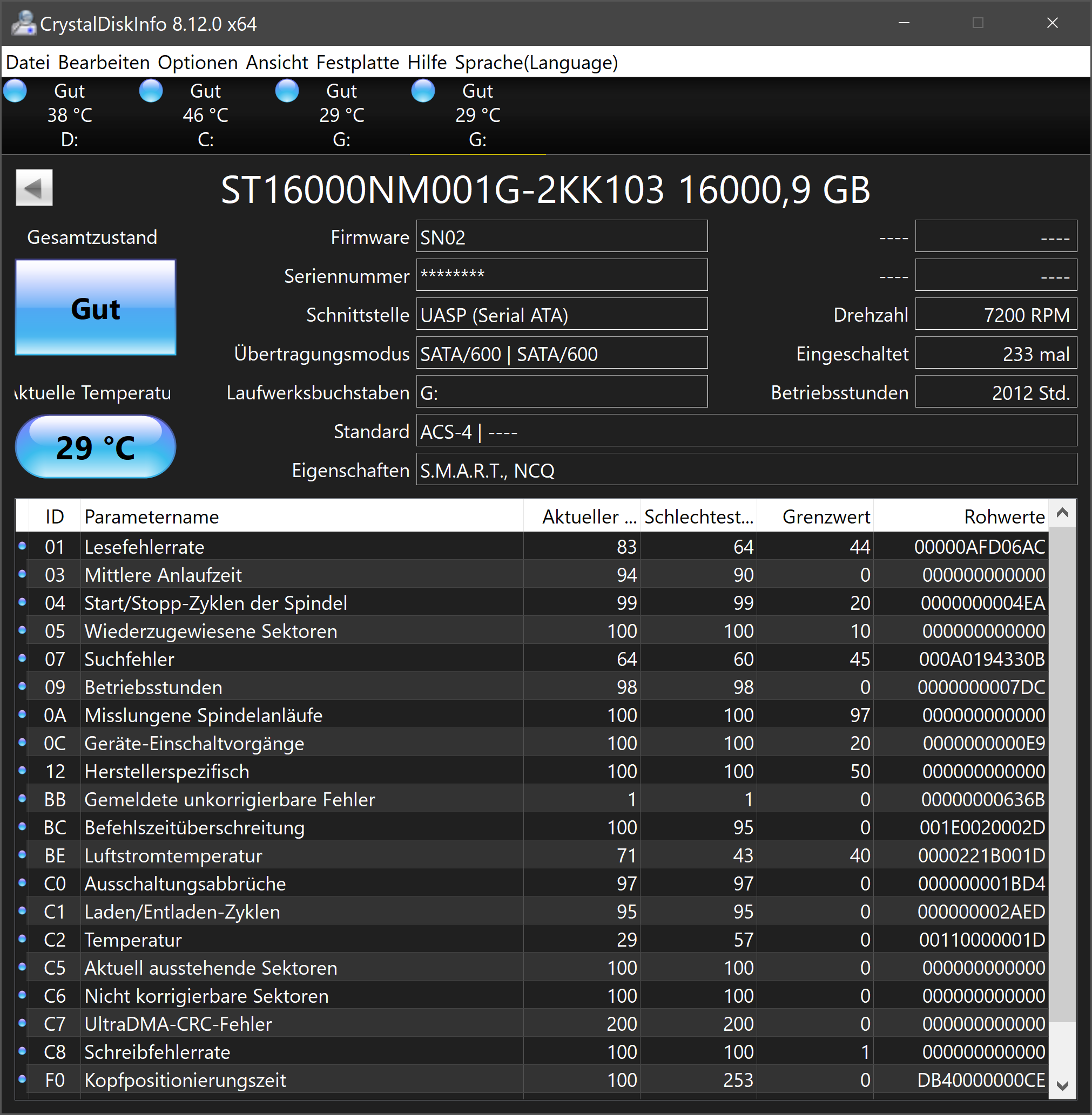 ich hatte ein anstrengendes Wochenende, zuerst machte meine 16 TB Platte Probleme die hatte sich immer wieder disconnected und dann hatte ich über eine Live CD die Daten auf eine andere Platte gepackt. Diese dann Formatiert jetzt läuft die seitdem erstmal, meine 10 TB WD Red Pro hatte dann plötzlich das Dateisystem bzw. die Partition verloren hatte vieles ausprobiert und am Ende hatte mir MiniTool Partition Wizard den Arsch gerettet. Ich konnte damit meine Partition wieder erweitern und neu mounten in dem ich die alte Partition wiederherstellen konnte. Meine Frage wäre hier sind meine beiden Platten noch ok? Ich habe beide Platten mit CrystalDisk die Werte gespeichert und unten angehangen. Ich kenne mich mit den S.M.A.R.T Werten nicht aus und frage euch, vielleicht gibt es hier paar Experten die mir sagen können, ob die Platten so weit ok sind.