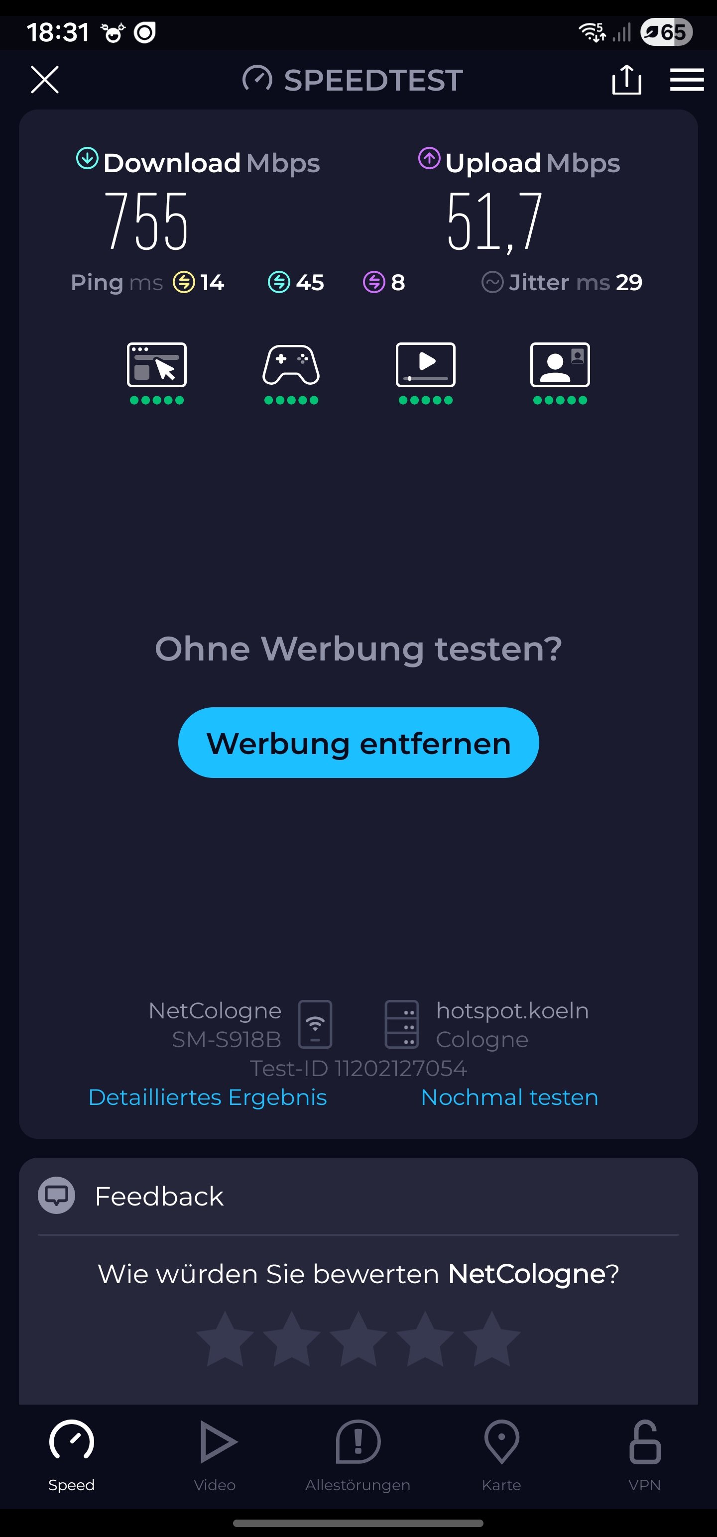 (Ich meine sogar schonmal bis zu 900 MBit/s erreicht zu haben, aber heute Abend war das Maximum 755 Mbit/s.)