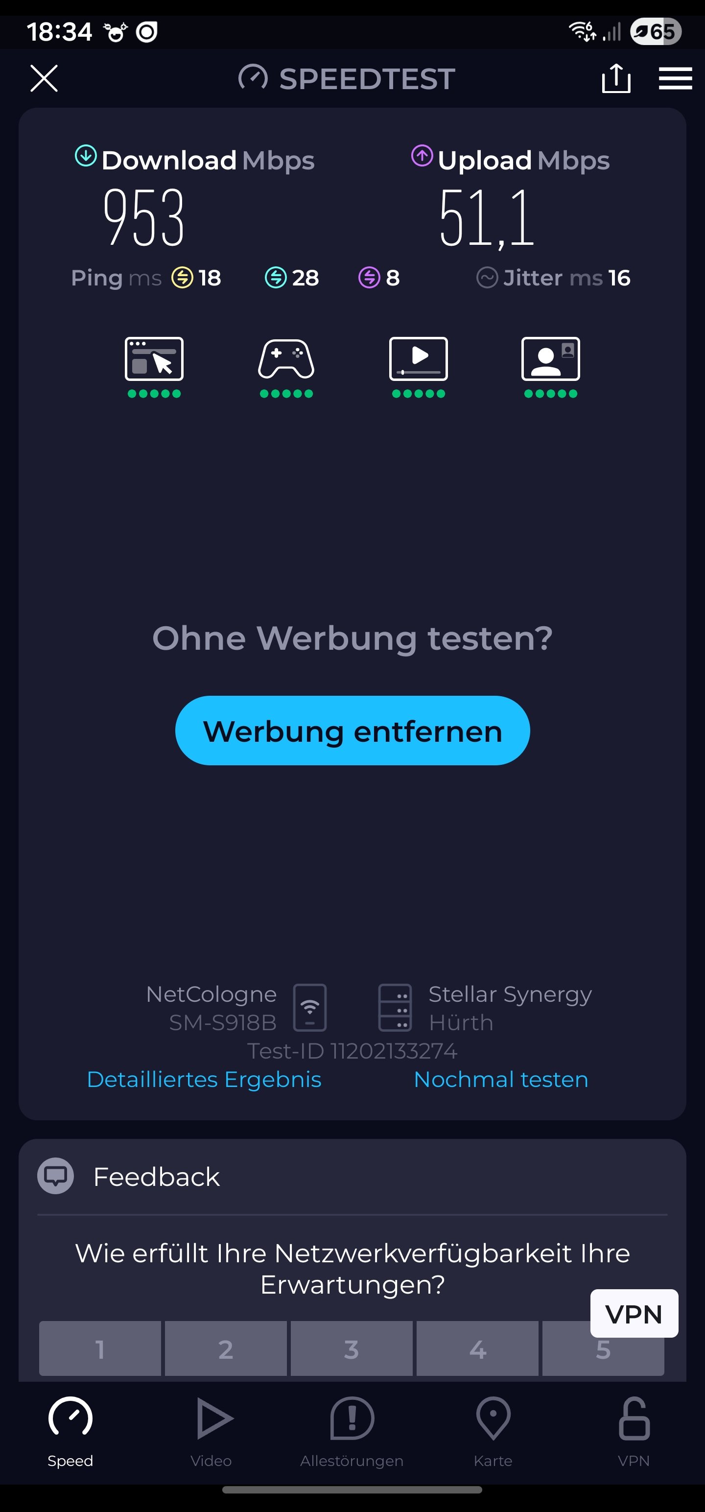 Von meinem Anbieter bekomme ich 1100/55 MBit/s an Bandbreite und mein Netzwerk ist auch auf 2,5 GBit/s aufgebaut. Daher bekomme ich auch Netto mit meinem Rechner etwas mehr als mit nur 1 GBit/s mit dem Lan-Kabel heraus.