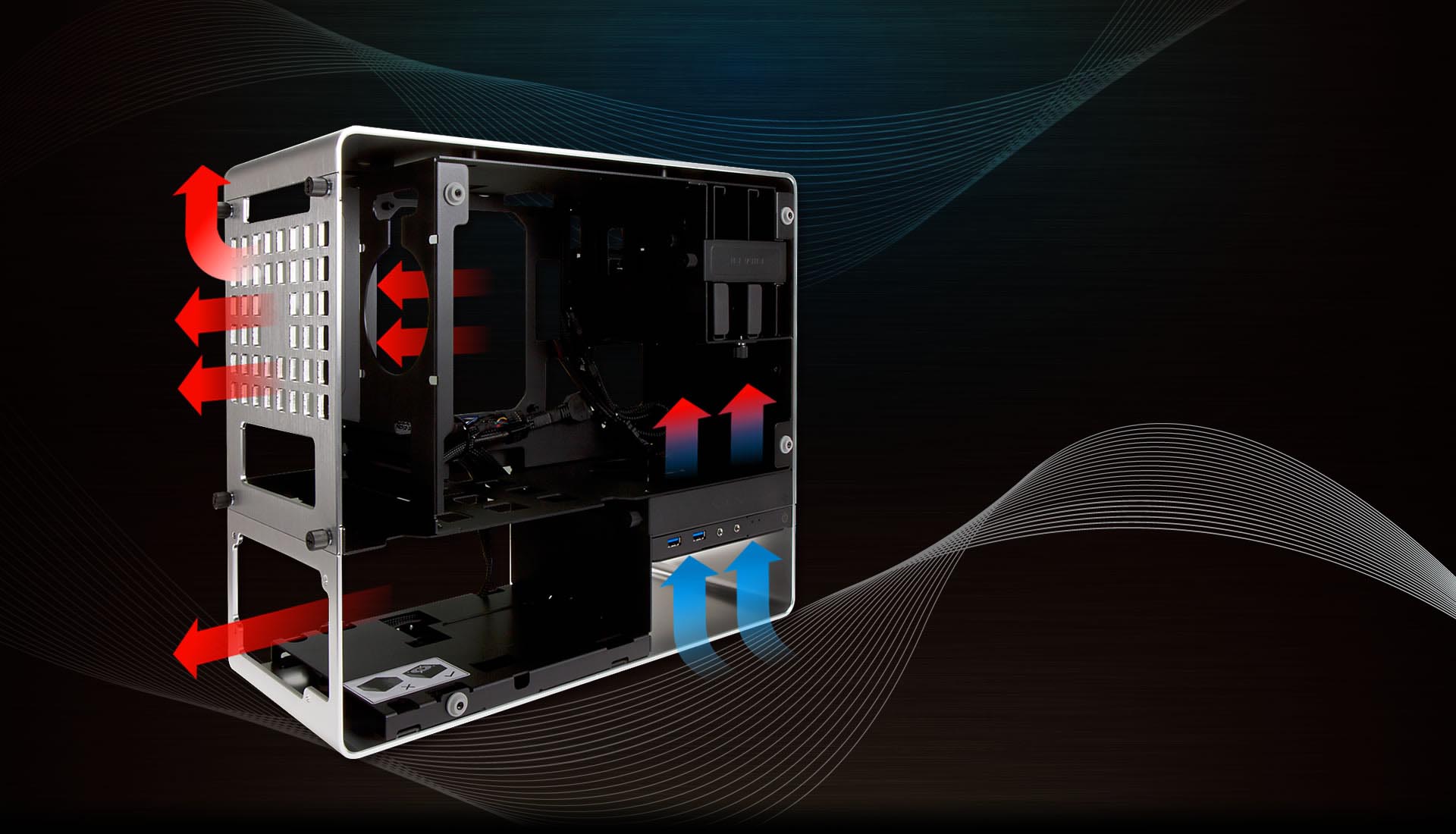 Was ich heraus lese ist, dass rechts unten von der rechteckigen freien Fläche Luft durch einen 120mm Lüfter hinein kommt, oben zur Grafikkarte und zum Mainboard durch zieht und hinten ein 92mm Lüfter die Warme Luft hinaus transportiert. Zusätzlich soll eine 120mm Wasserkühlung Platz haben (Komplettwasserkühlung) und hinten am PC befestigt werden. Sind der 92mm Lüfter und die Wasserkühlung (also beides) notwendig, um einen guten Airflow hinzukriegen?