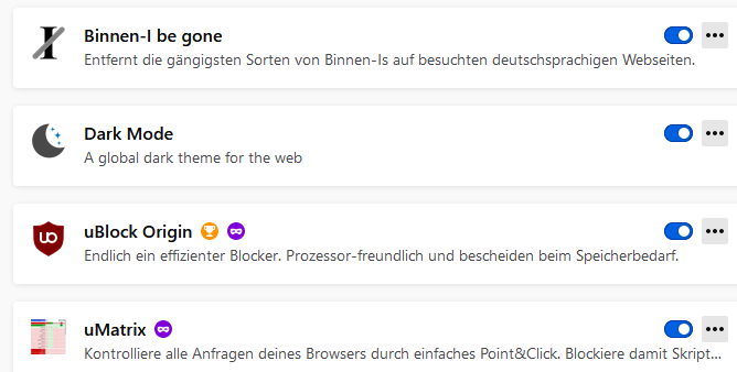 uBlock Origin, Privacy Badger, NeatURL, Smart Referer und Skip Redirect. Wobei die letzten drei je nach Seite gut oder weniger gut laufen. Muss man individuell testen.