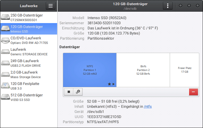 fstrim, blkdiscard, wiper.sh lieferten alle nur Fehlermeldungen, während ich USB-SSDs problemlos an allen USB-Ports des PCs trimmen kann: Sogar am USB3-Hub, der am USB3-Hub des TFTs angeschlossen ist, der am Back-USB3 des PCs angeschlossen ist.