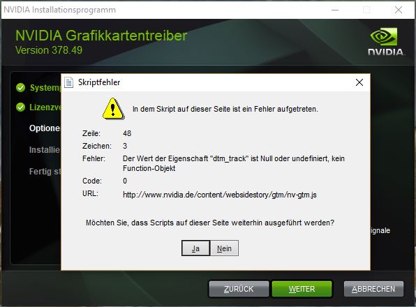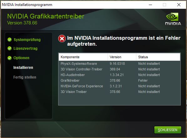 Das Problem trat beim Update auf den 378.66 vom 378.49 auf, jetzt allerdings auch beim Versuch den 378.49 erneut zu installieren. Der Installationsvorgang läuft zwar noch ein wenig weiter, egal ob ich "ja" oder "nein" anklicke, allerdings bricht er dann mit einem Fehler ab (ohne mir weiteres mitzuteilen).