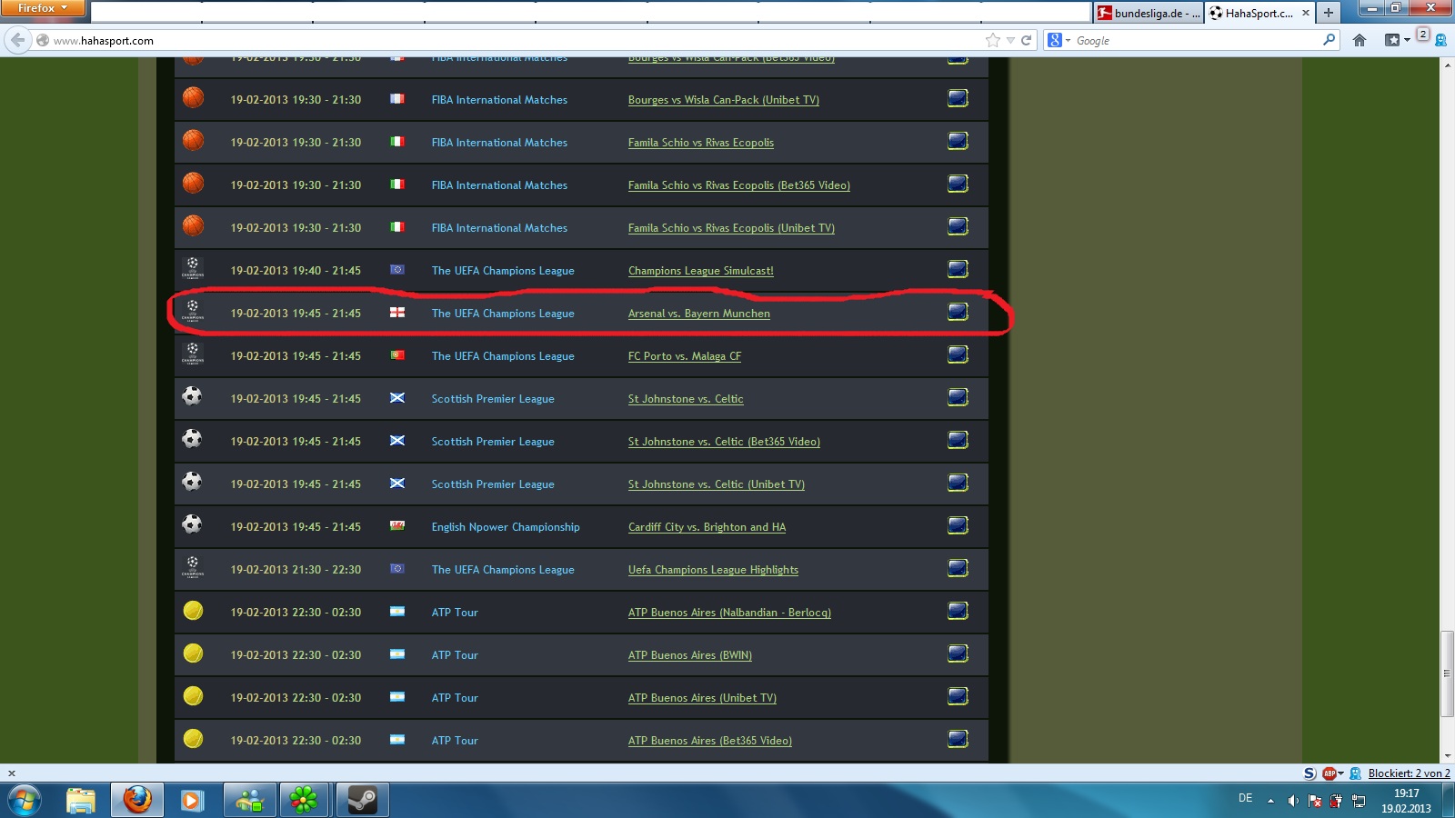 Ich werd hier keine Links posten, nur einen Tip. Es ist nicht so gut die Paarung zu googlen, also arsenal bayern livestream z.B. Besser sind solche Seiten wie hahasport, in denen nach Sportarten chronologisch alles aufgelistet ist.