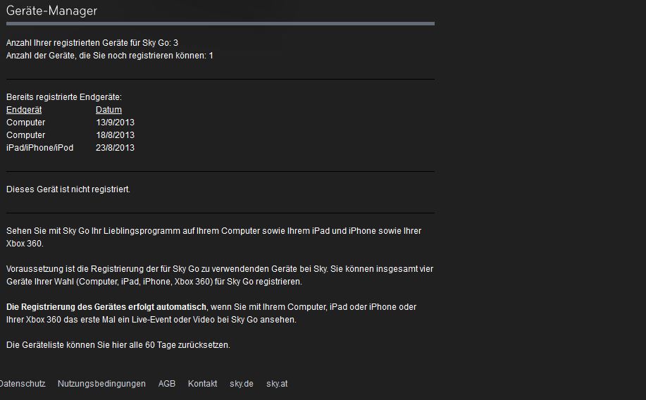 --> Auf meinen SkyGo Account sind 3 von 4 Geräten registriert (d.h. ein Gerät wäre momentan noch frei)