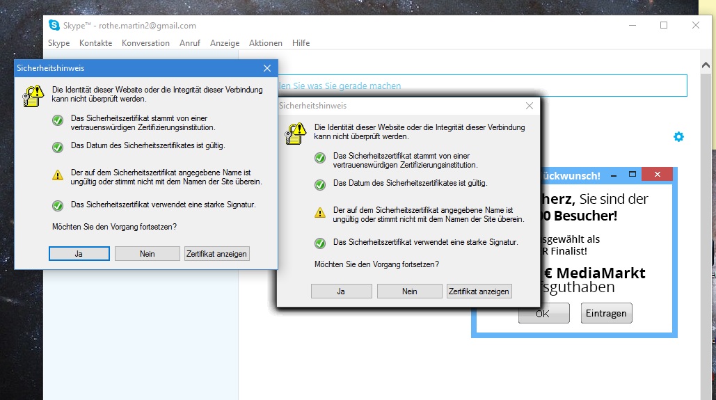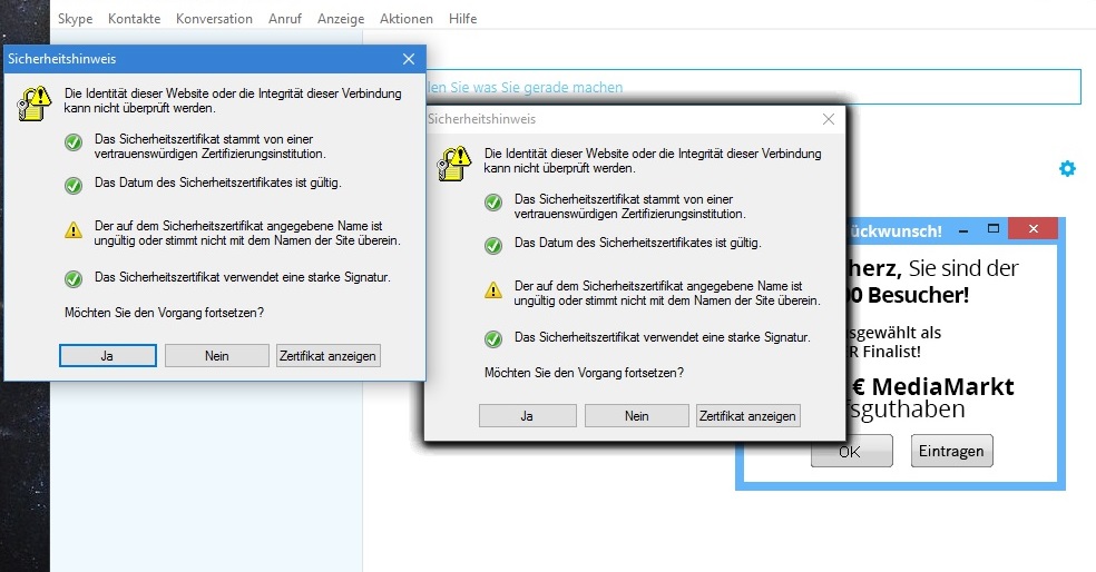 das Skype immer schön Werbung einblendet ist ja nix neues aber seit ein paar Wochen werden ziemlich regelmäßig Sicherheitshinweise eingeblendet, oft gleich mehrere auf einmal: