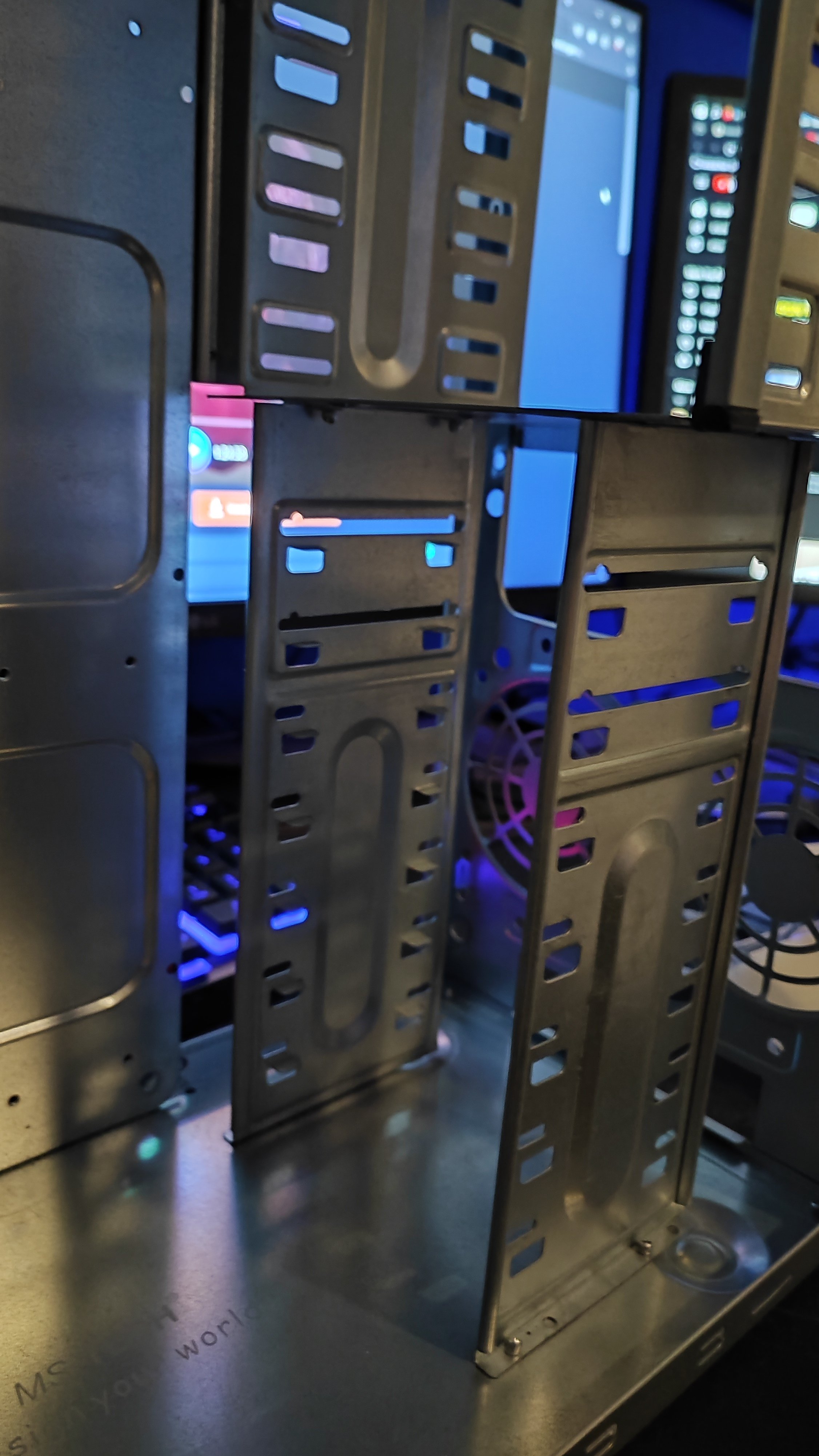 Die Halterung für die 3,5 Zoll Schächte kommt auf der Seite zur Öffnung hin ein Stück weg, damit die beiden 120 mm Lüfter im Boden platz haben.