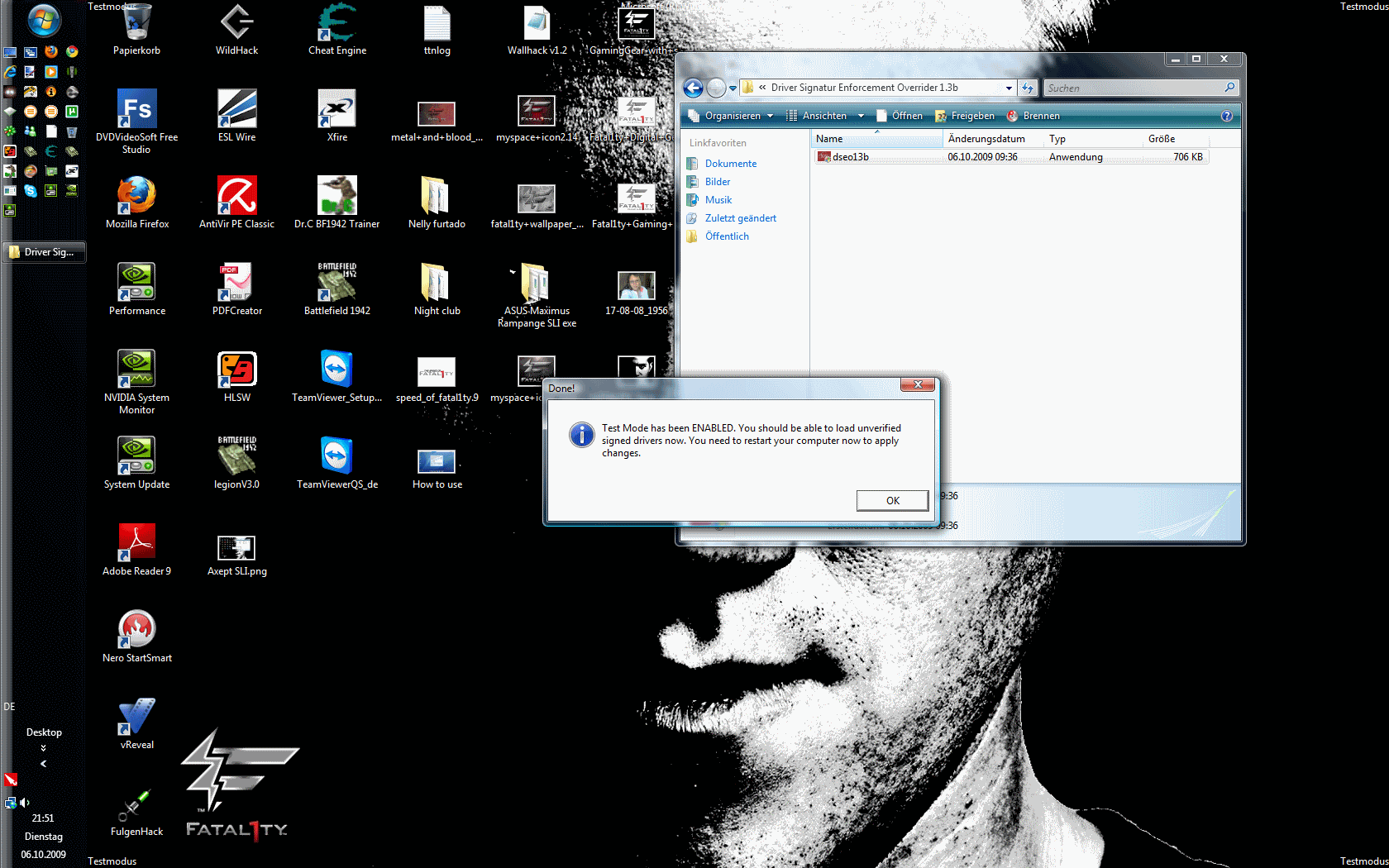 Unten rechts steht Test Modus da du ja im 6. Schritt mithilfe des "Driver Signature Enforcement Overrider" dem Test Modus aktiviert hast um den modifizierten Treiber zu laden. (Enable Testmode = Test Modus aktivieren