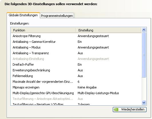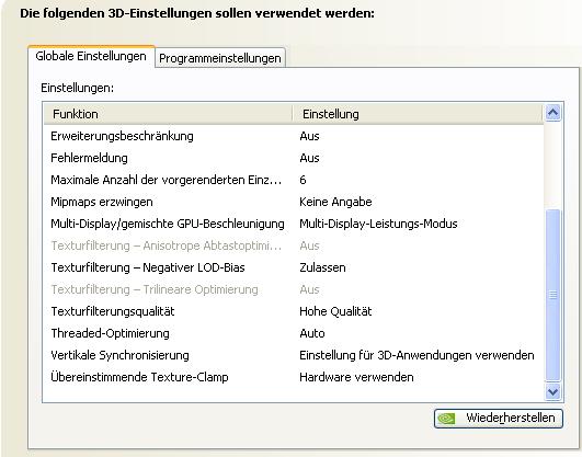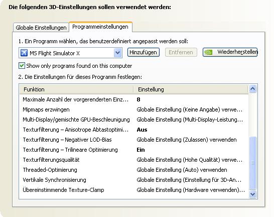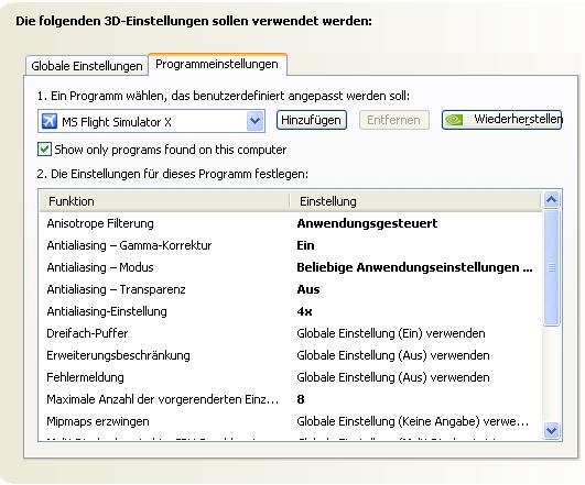 Anbei meine 3D-Einstellungen beim FlightX. Du solltest bedenken, dass du erst über das jeweilige Programm wie Flight oder Crysis mögliche Einstellungen vornimmst und dann erst in der NVidia-Systemsteuerung verfeinerst.
