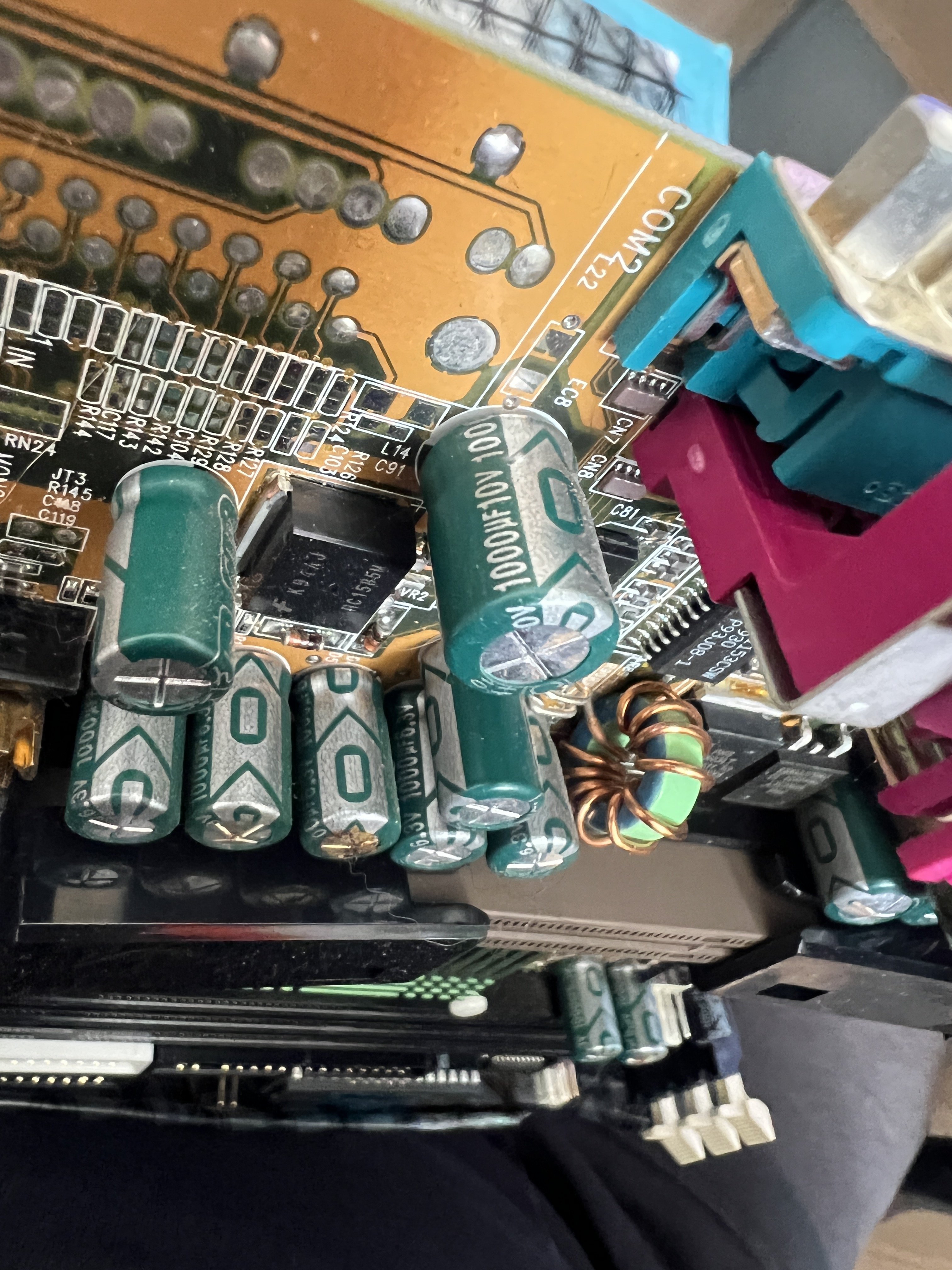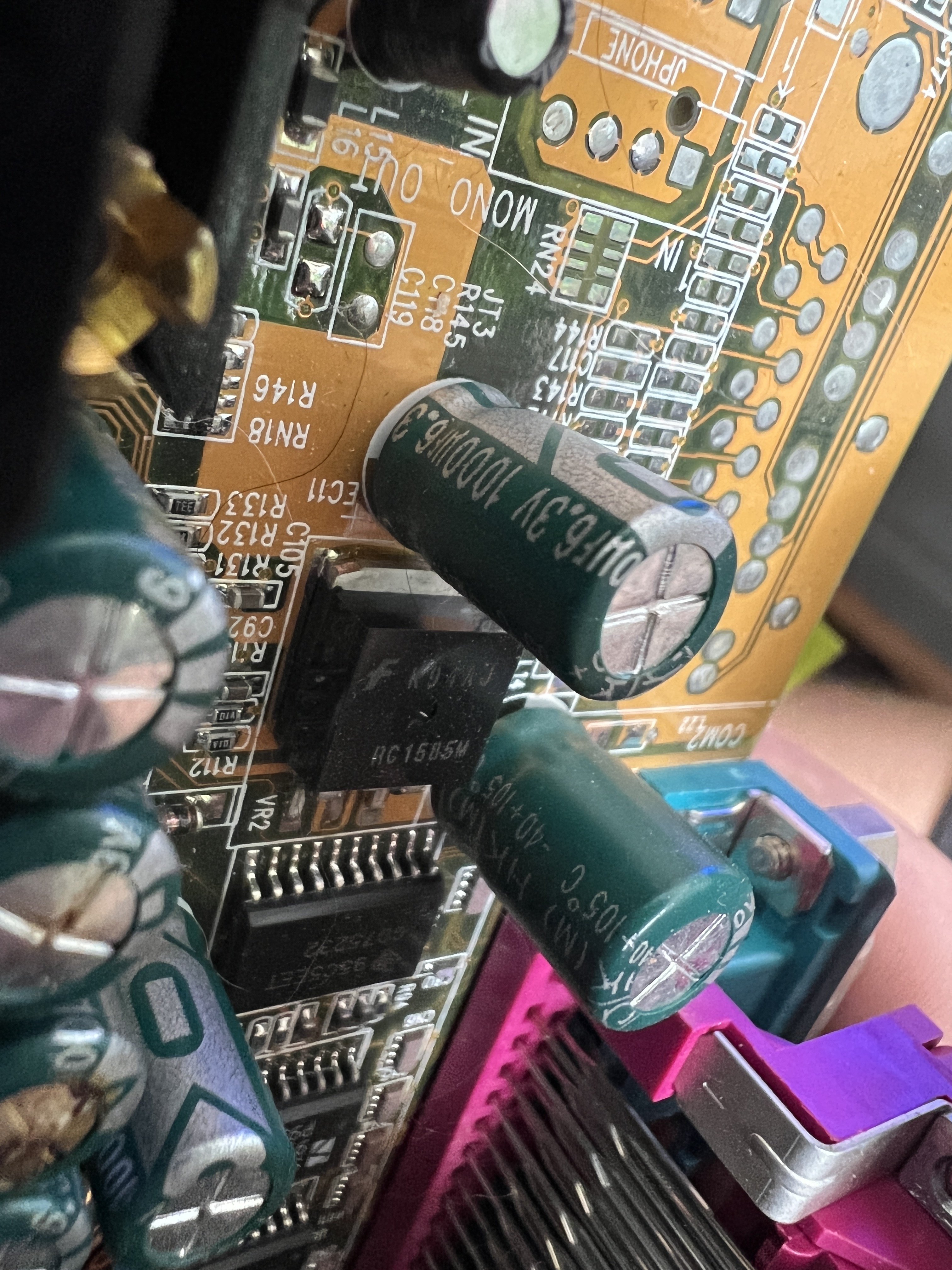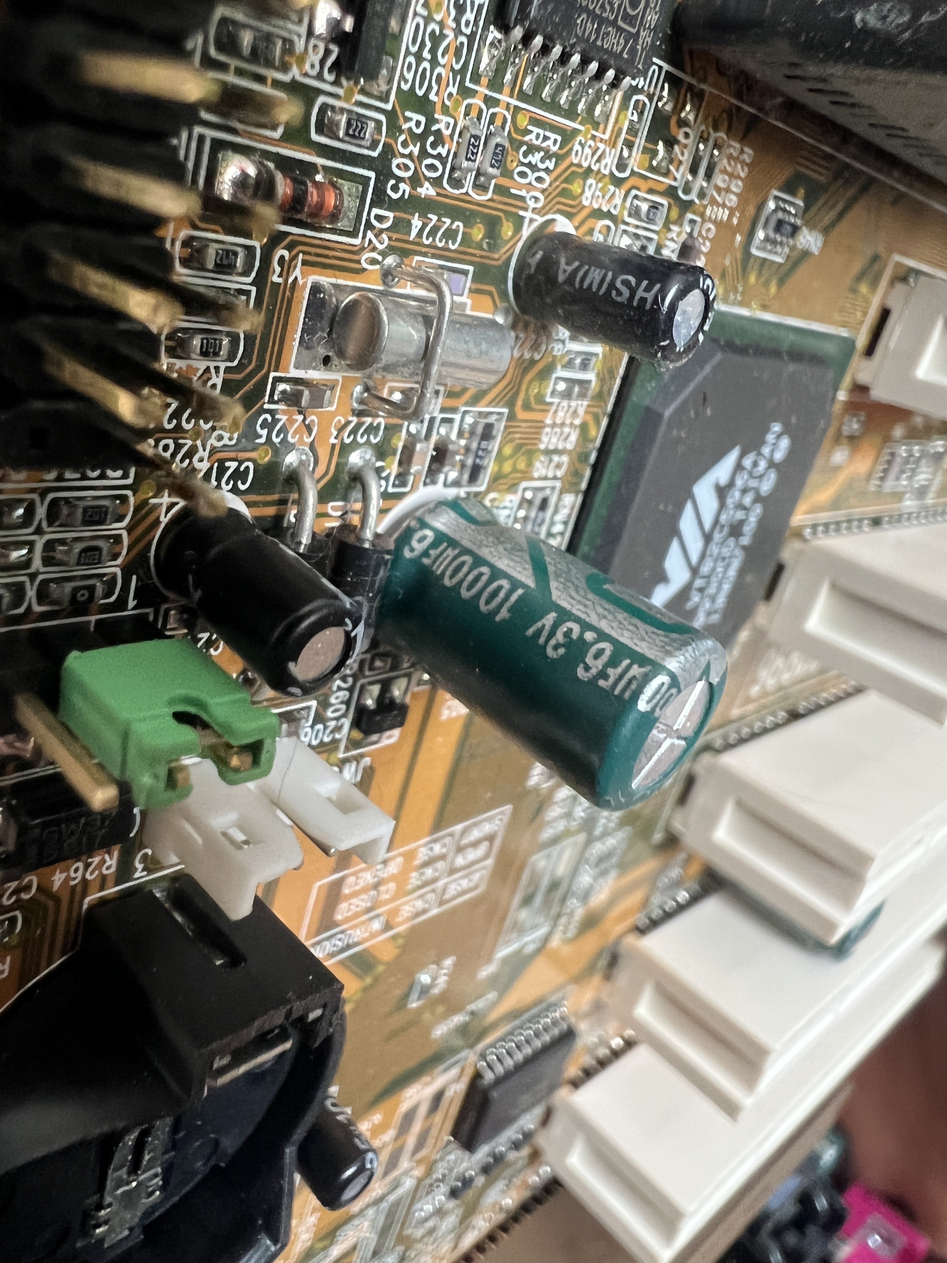 Generell musst du noch aufpassen, das der Durchmesser der neuen Caps möglichst identisch mit den alten ist. Der Pinabstand (Pitch) ist je nach Durchmesser durchaus verschieden. Und die Höhe ist insbesondere neben dem Cpu Slot und AGP/PCI zu beachten, sonst bekommst du keine Erweiterungskarten mehr rein. PCI müsste 16 oder 17mm hoch sein.
