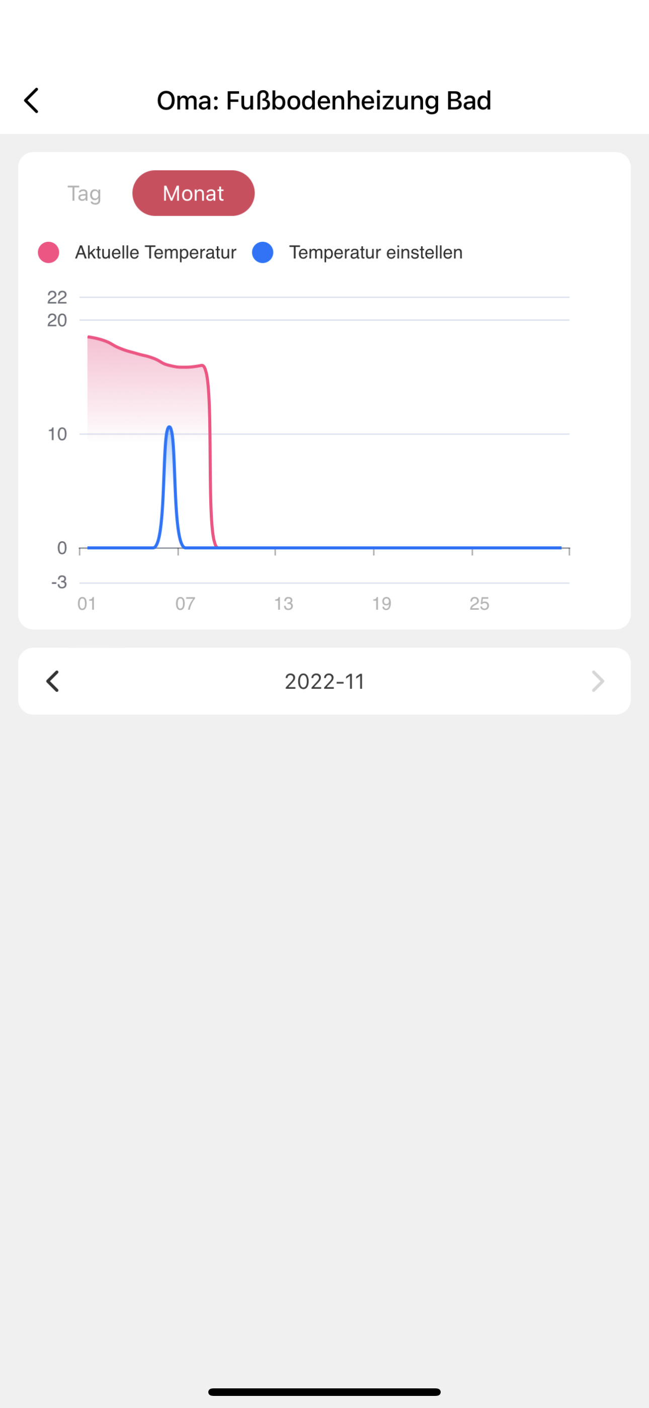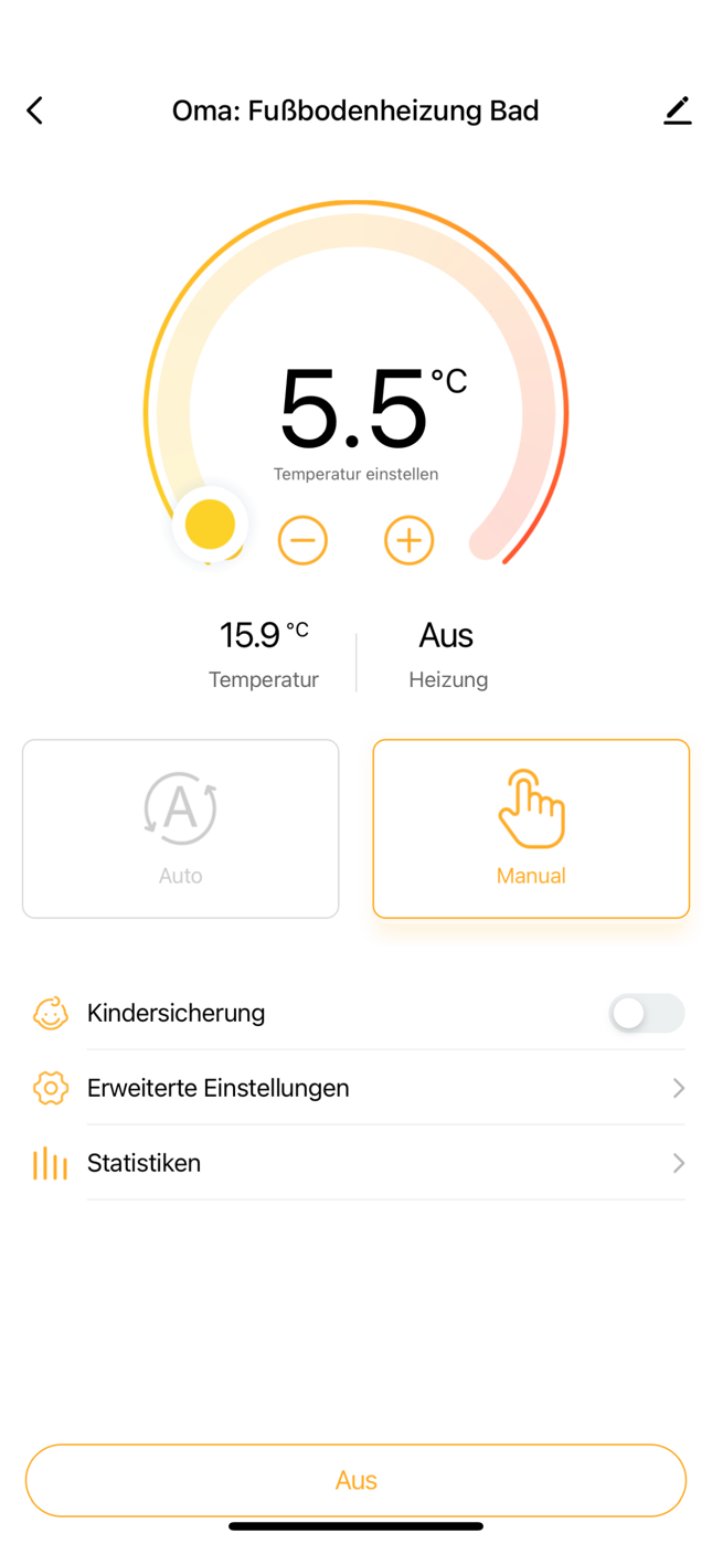Im Badezimmer ist eine Elektrofußheizung verlegt. Das (Digital)Thermostat befindet sich allerdings außerhalb des Badezimmers und ist per Bodenfühler mit dem Bad verbunden. Warum das so verlegt ist, kann ich nicht sagen. Wir müssen damit irgendwie klar kommen und nun suche ich eine Lösung für das folgende Problem: