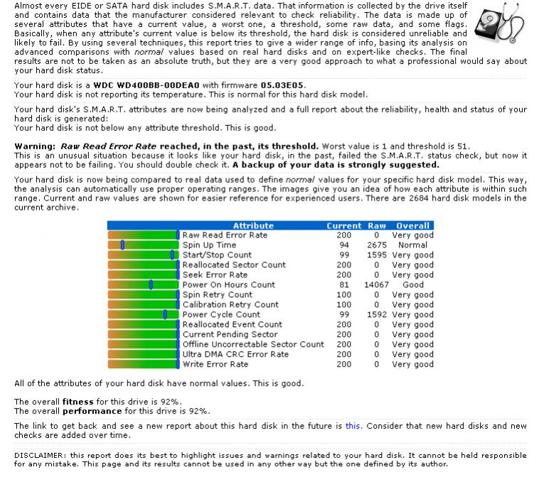 Hier im Spoiler mal ein SMART Ergebnis. Ich vertraue der Festplatte weiterhin Backups an. Für ihr Betriebsalter ist sie weiterhin im guten Zustand. Bitte nicht wundern. Maxtor gibt die Betriebszeit in Minuten an. Es findet ein Reset um 80000 statt