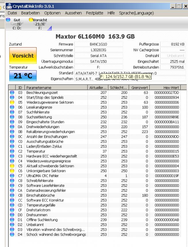 Was hat CrystalDiskInfo bei den anderen Platten auszusetzen? Da würde ich mir bei Status gelb schon eher Gedanken machen...