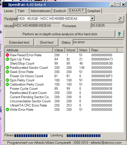 Fast 48000 Stunden / 5,5 Jahre Dauerbetrieb, und nur eine Handvoll defekter Sektoren. Spitze!! Die guten alten Maxtor-Platten...